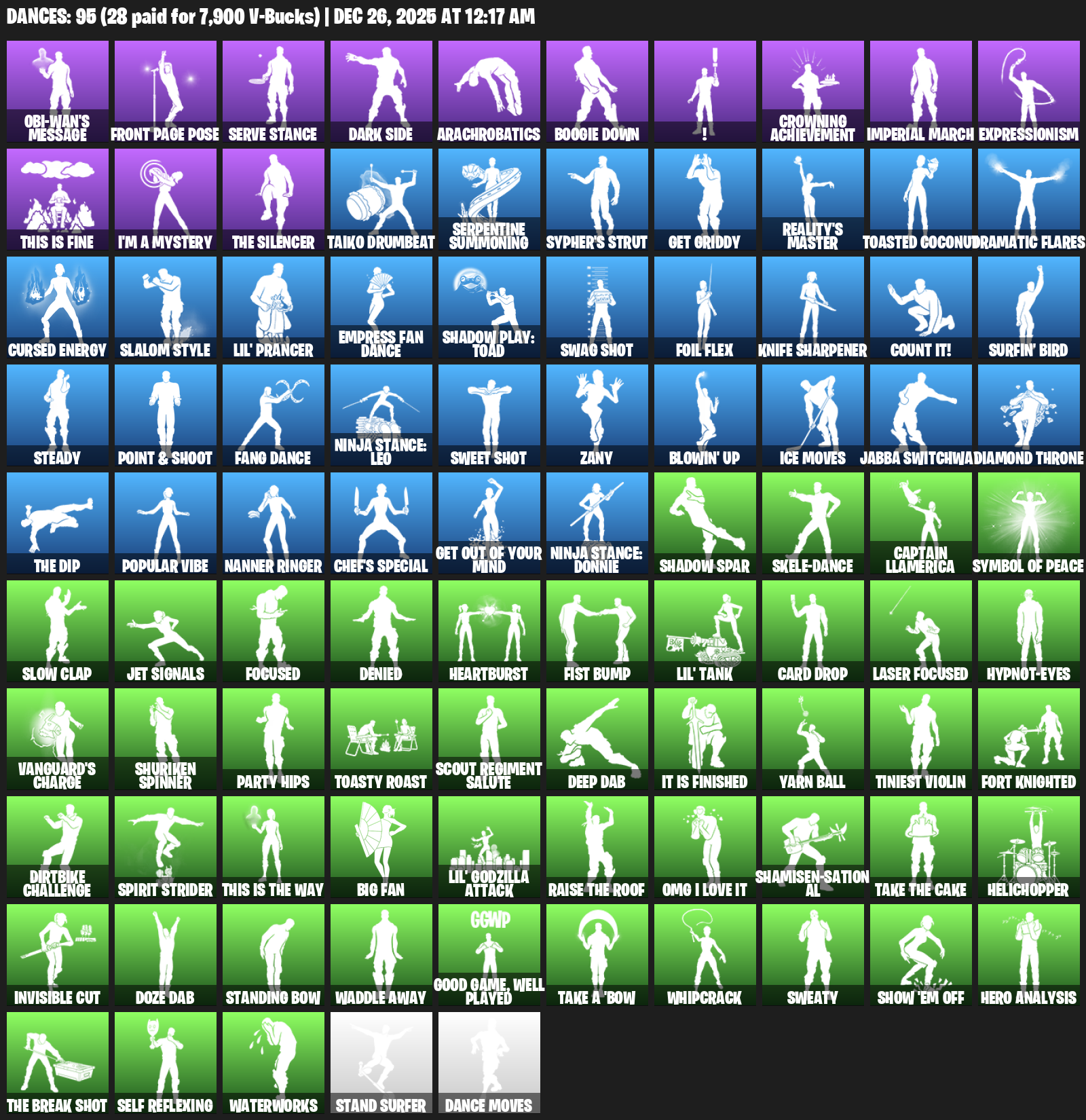 Obi-Wan’s Message, Front Page Pose, Serve Stance, Dark Side, Arachrobatics, Boogie Down, !, Crowning Achievement, Imperial March, Expressionism, This is Fine, I’m a Mystery, Taiko Drumbeat, Serpentine Summoning, Sypher’s Strut, Get Griddy, Reality’s Master, Toasted Coconut, Dramatic Flares
