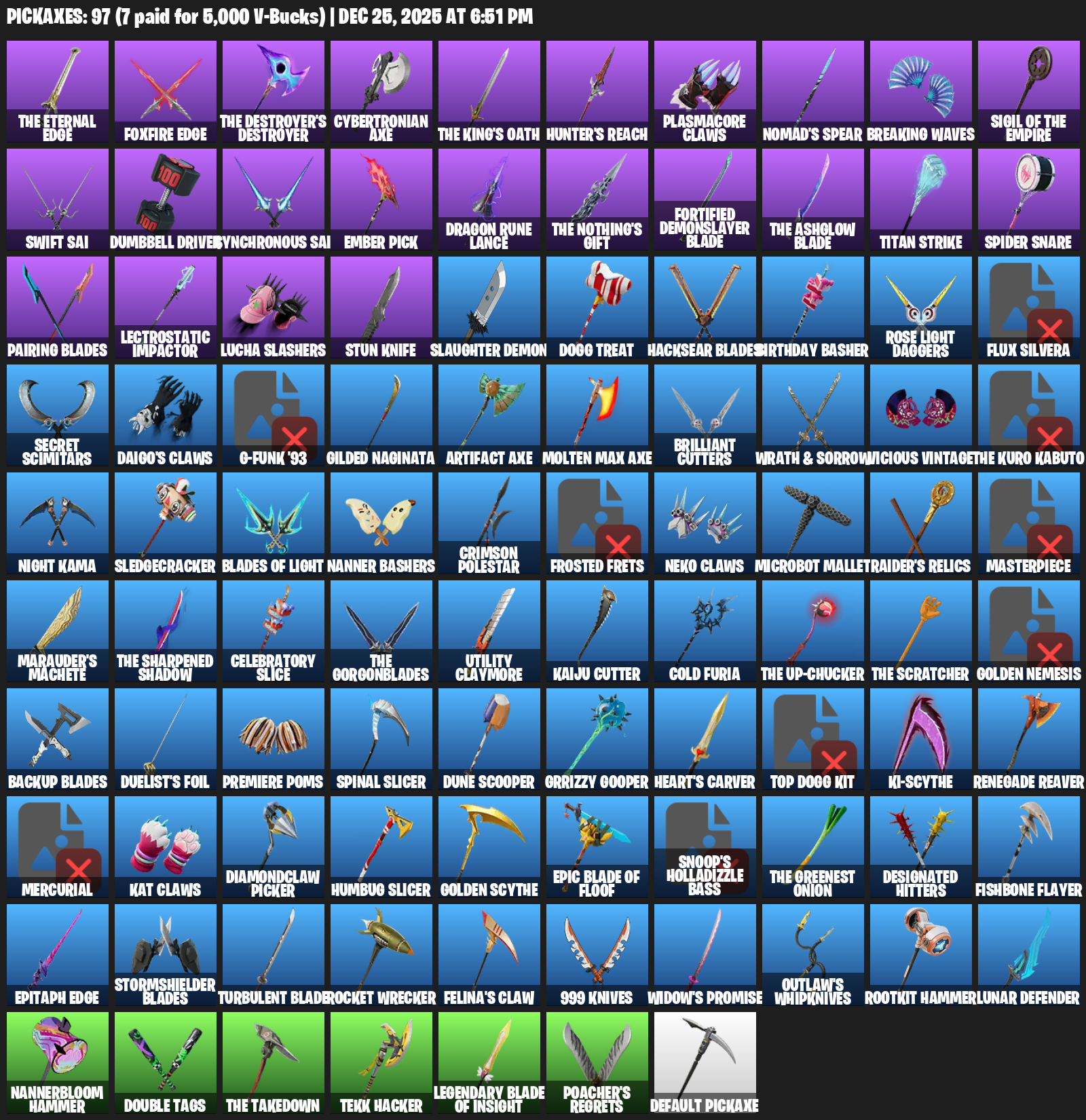 Foxfire Edge, Cybertronian Axe, Hunter’s Reach, Plasmacore Claws, Nomad’s Spear, Breaking Waves, Swift Sai, Dumbbell Driver, Ember Pick, Dragon Rune Lance, Fortified Demonslayer Blade, Titan Strike, Spider Snare