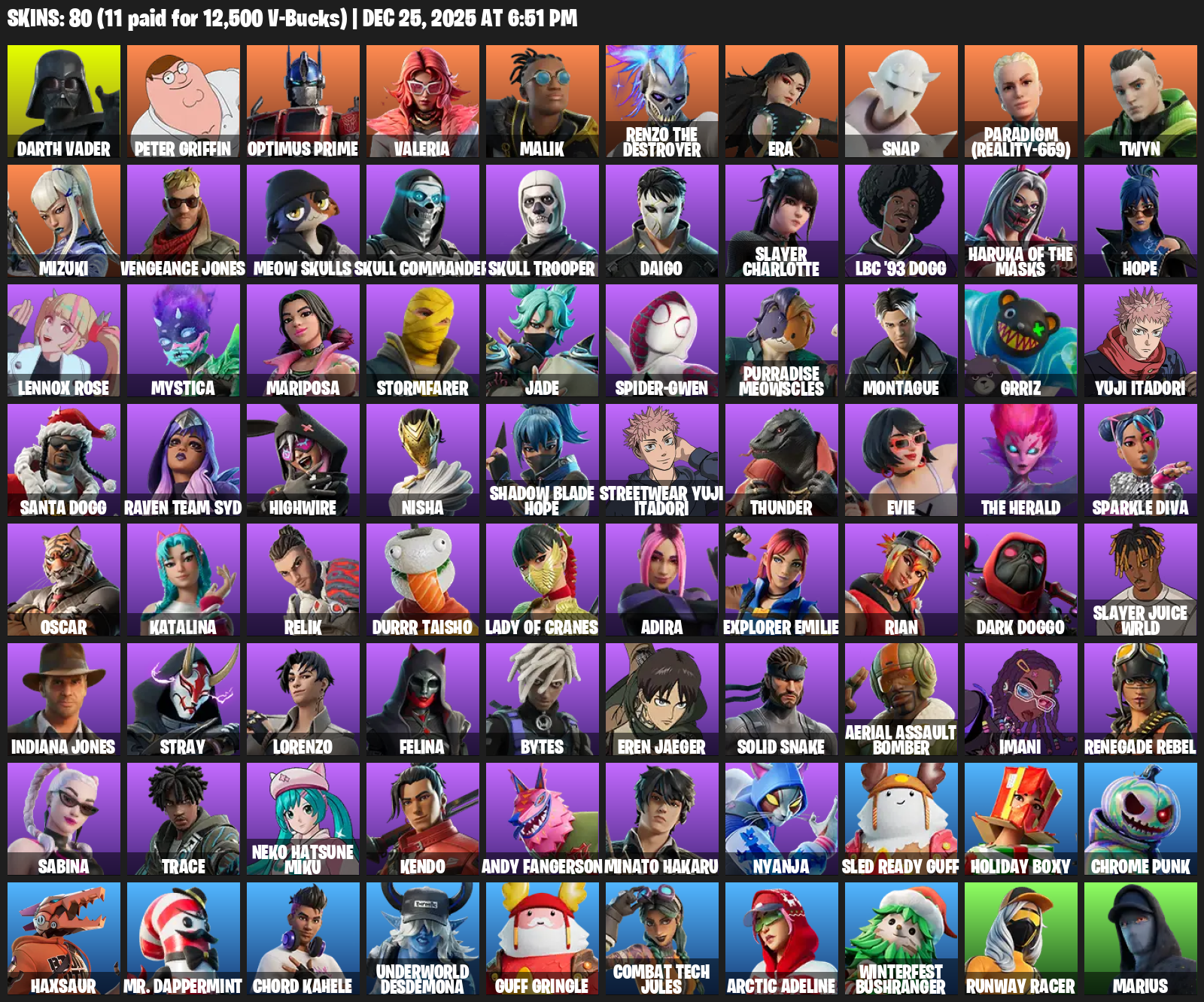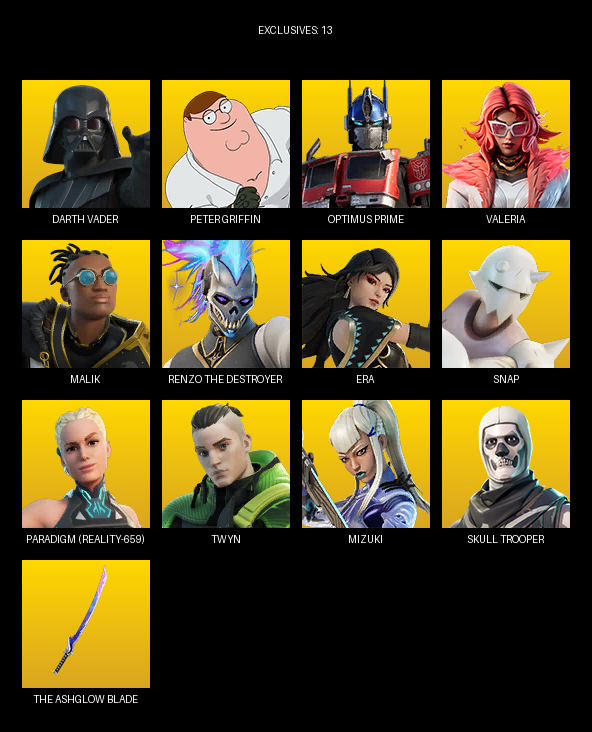 Darth Vader, Peter Griffin, Optimus Prime, Valeria, Malik, Renzo the Destroyer, Era, Snap, Paradigm (Reality-659), Twyn, Mizuki, Vengeance Jones, Meow Skulls, Skull Commander, Daigo, Slayer Charlotte, LBC ’93 Dogg, Hope
