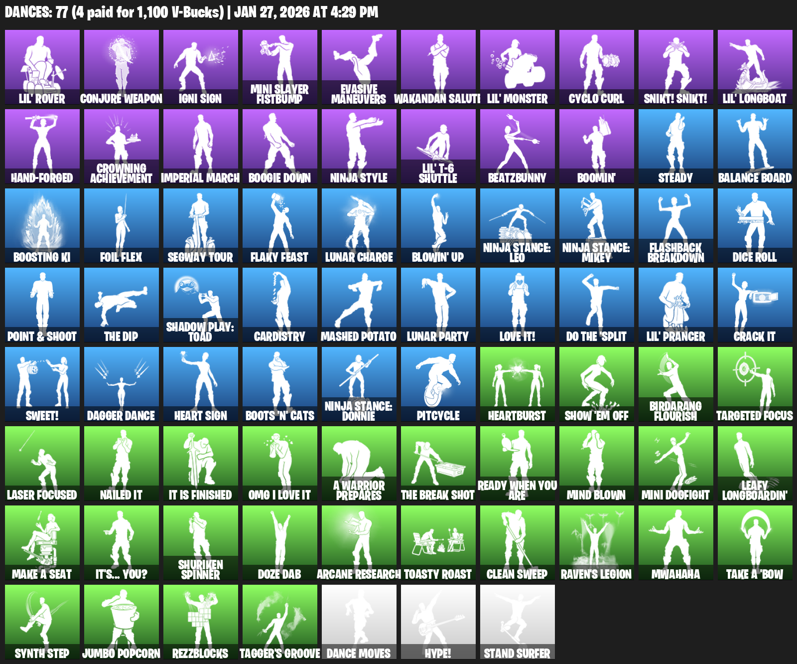 Lil’ Rover, Conjure Weapon, Igni Sign, Mini Slayer Fistbump, Evasive Maneuvers, Wakandan Salute, Cyclo Curl, Snikt! Snikt!, Hand-Forged, Crowning Achievement, Imperial March, Boogie Down, Ninja Style, BeatzBunny, Boomin’, Steady, Balance Board