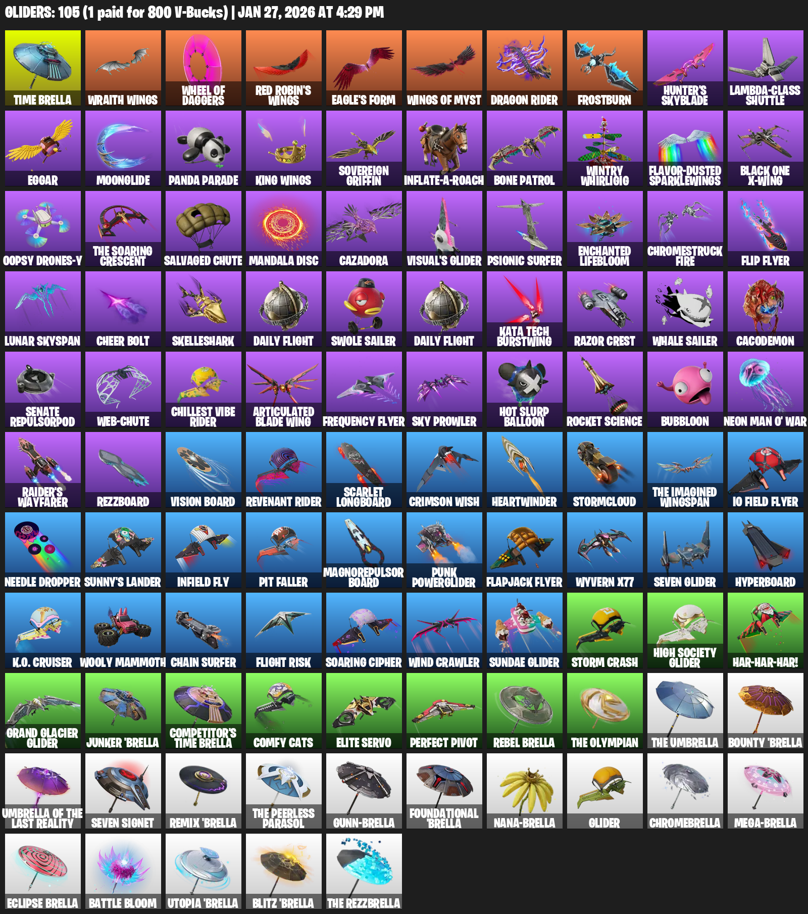Time Brella, Wraith Wings, Eagle’s Form, Dragon Rider, Frostburn, Hunter’s Skyblade, Lambda-Class Shuttle, Eggar, Moonglide, Panda Parade, Sovereign Griffin, Inflate-A-Roach, Bone Patrol, Wintry Whirligig, Flavor-Dusted Sparklewings, Black One X-wing