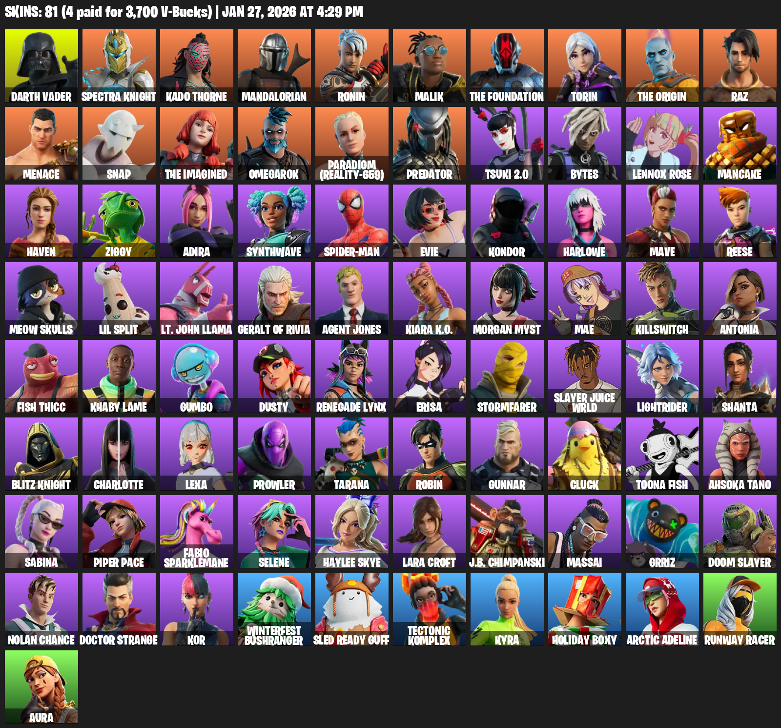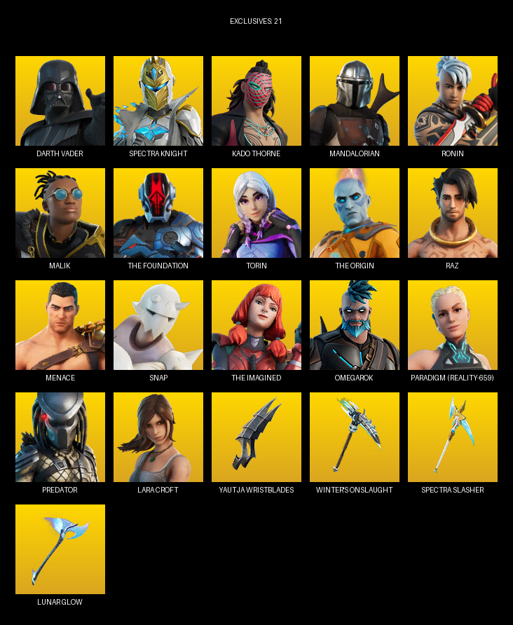 Lara Croft, Darth Vader, Spectra Knight, Kado Thorne, Mandalorian, Ronin, Malik, The Foundation, Torin, Raz, Menace, Snap, Omegarok, Paradigm (Reality-659), Predator, Tsuki 2.0, Bytes, Lennox Rose
