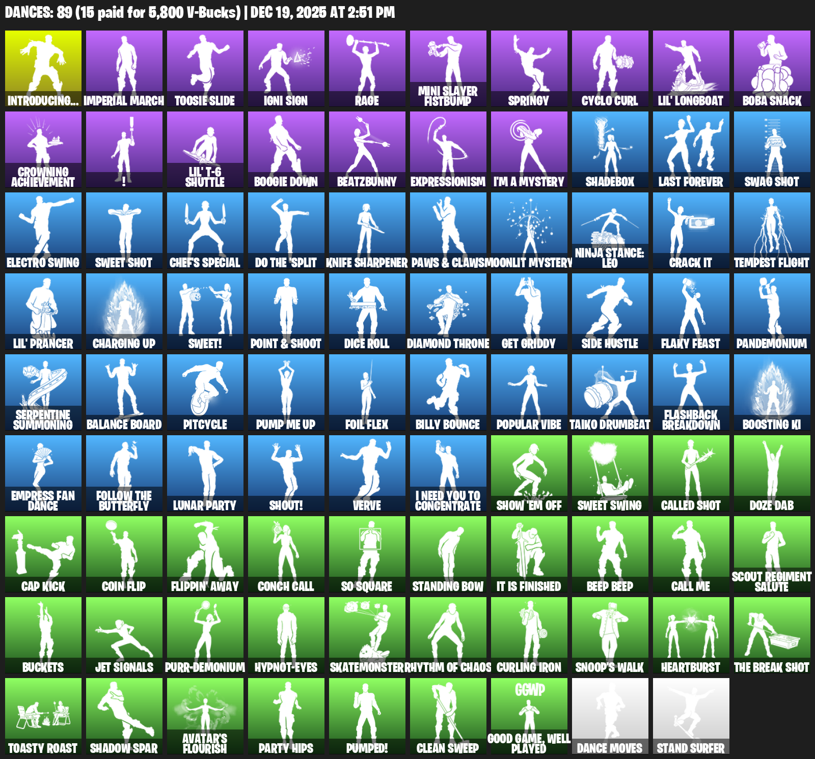 Introducing…, Imperial March, Toosie Slide, Igni Sign, Rage, Mini Slayer Fistbump, Springy, Cyclo Curl, Lil’ Longboat, Boba Snack, Crowning Achievement, !, Boogie Down, BeatzBunny, Expressionism, I’m a Mystery, Shadebox, Last Forever, Swag Shot