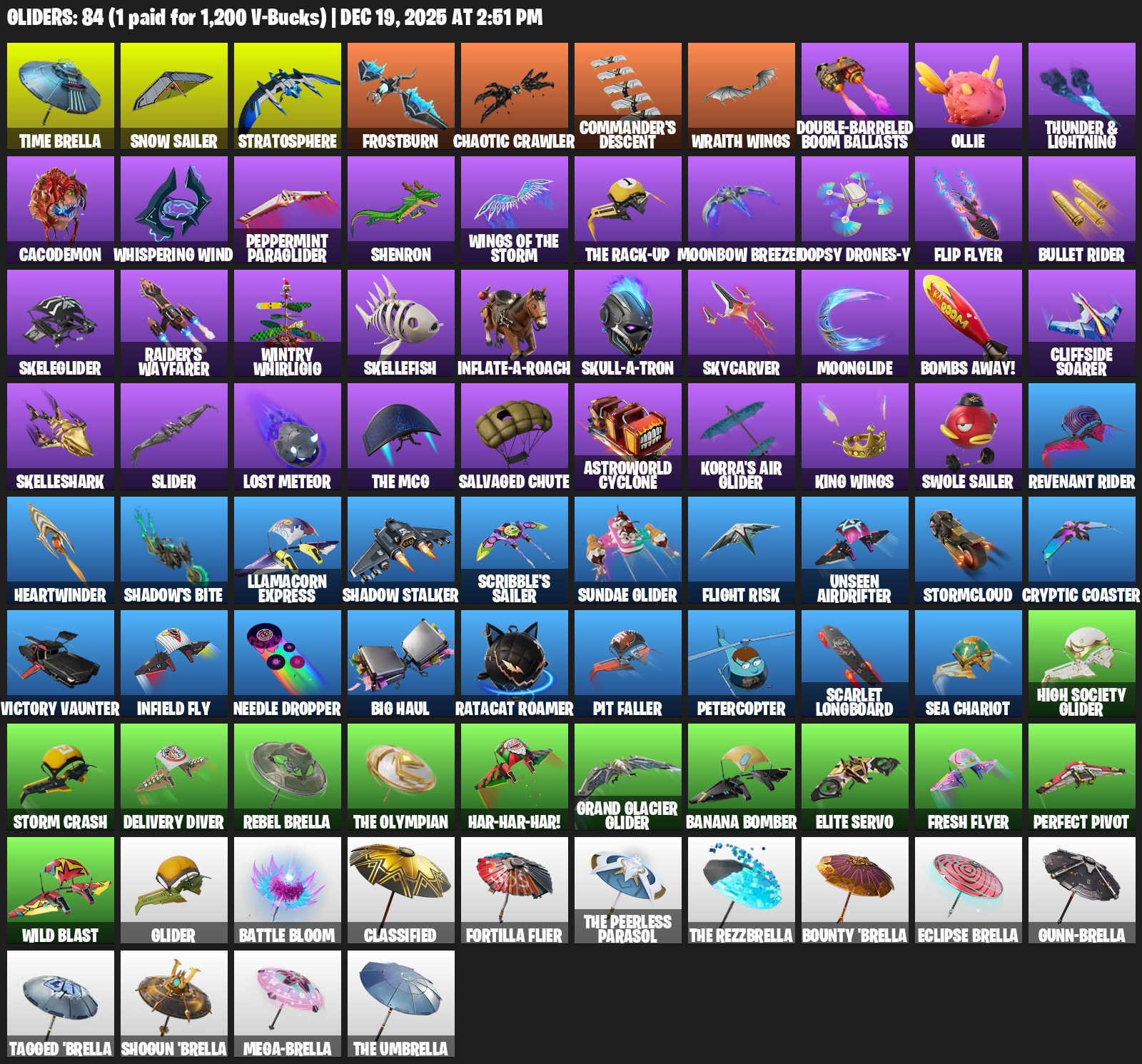 Time Brella, Snow Sailer, Stratosphere, Frostburn, Chaotic Crawler, Commander’s Descent, Wraith Wings, Double-Barreled Boom Ballasts, Ollie, Thunder & Lightning, Cacodemon, Whispering Wind, Peppermint Paraglider, Shenron, Moonbow Breezer, Oopsy Drones-y, Flip Flyer, Bullet Rider