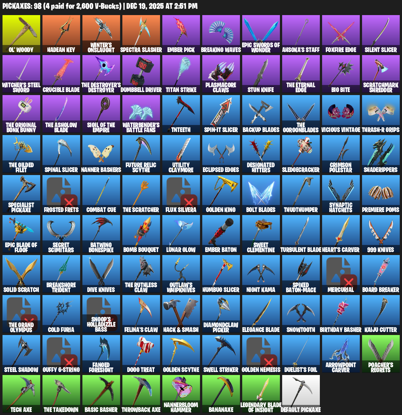 Ol’ Woody, Hadean Key, Winter’s Onslaught, Ember Pick, Breaking Waves, Ahsoka’s Staff, Foxfire Edge, Silent Slicer, Witcher’s Steel Sword, Crucible Blade, Dumbbell Driver, Titan Strike, Plasmacore Claws, Stun Knife, Big Bite, Scratchmark Shredder