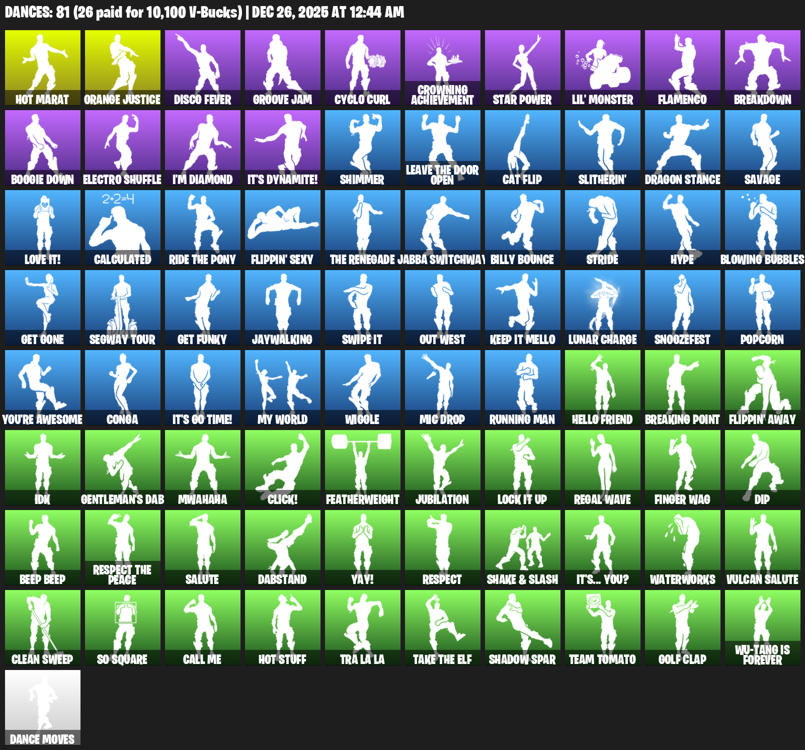 Hot Marat, Orange Justice, Disco Fever, Groove Jam, Cyclo Curl, Crowning Achievement, Star Power, Lil’ Monster, Flamenco, Breakdown, Boogie Down, Electro Shuffle, I’m Diamond, It’s Dynamite!, Shimmer, Cat Flip, Slitherin’, Dragon Stance, Savage
