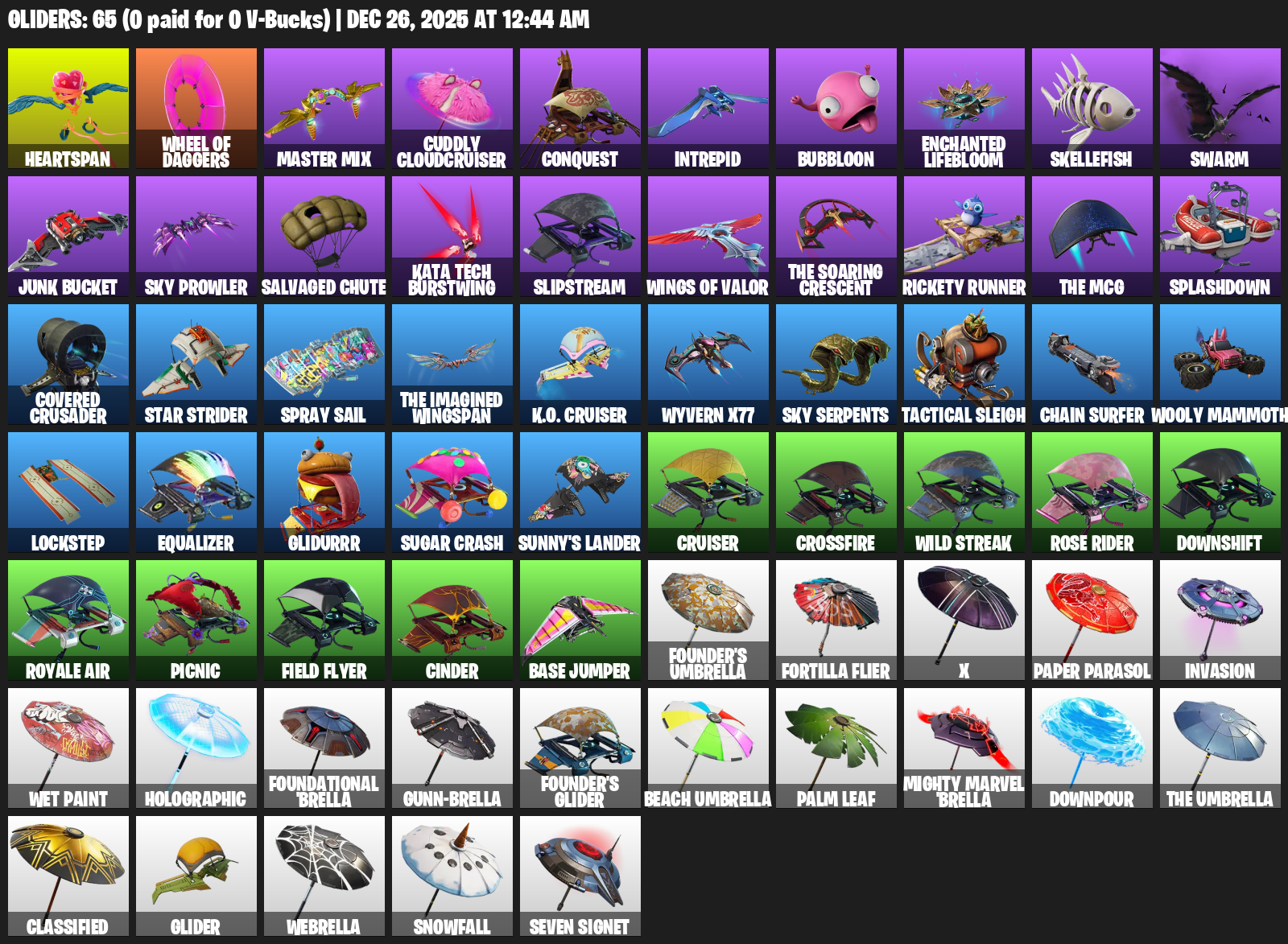 Heartspan, Master Mix, Cuddly Cloudcruiser, Conquest, Intrepid, Bubbloon, Enchanted Lifebloom, Skellefish, Swarm, Junk Bucket, Sky Prowler, Salvaged Chute, Kata Tech Burstwing, Slipstream, Rickety Runner, Splashdown