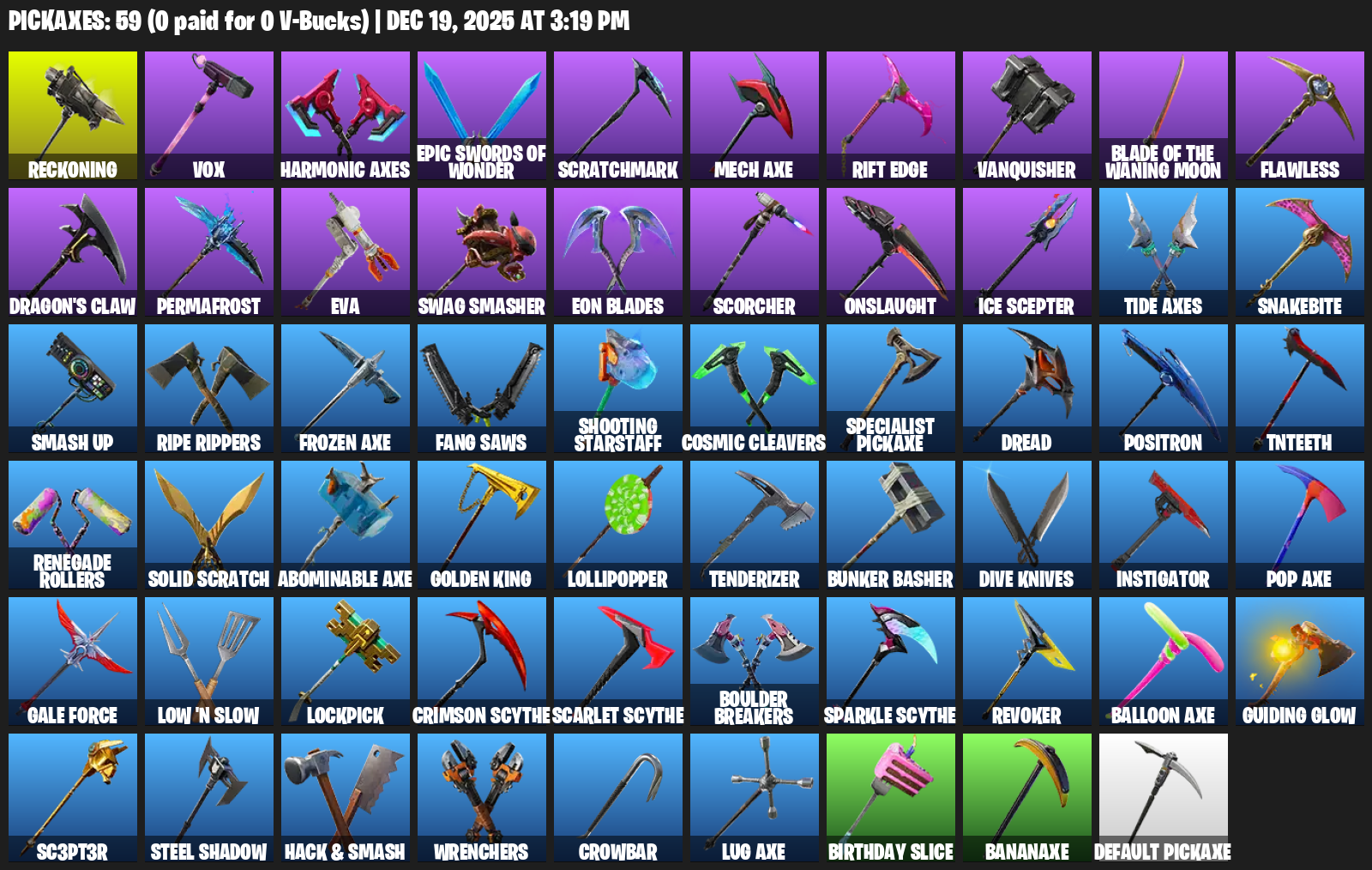 Reckoning, Vox, Harmonic Axes, Scratchmark, Mech Axe, Rift Edge, Vanquisher, Flawless, Dragon’s Claw, Permafrost, EVA, Swag Smasher, Eon Blades, Scorcher, Onslaught, Snakebite