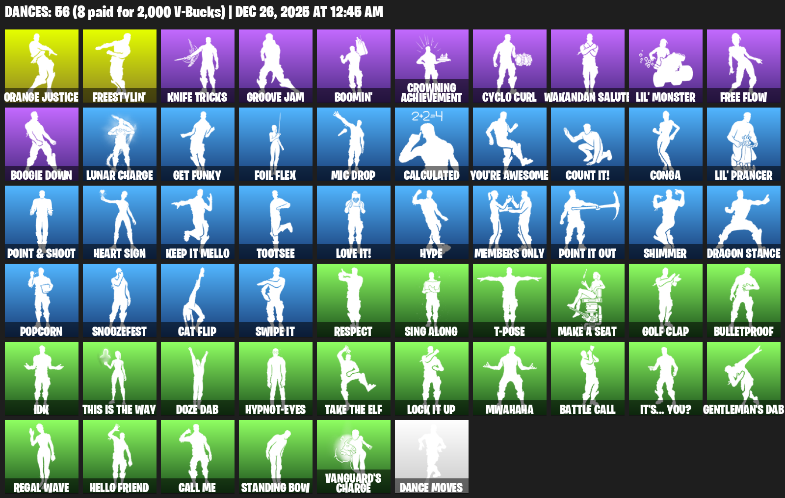 Orange Justice, Freestylin’, Knife Tricks, Groove Jam, Boomin’, Crowning Achievement, Cyclo Curl, Wakandan Salute, Lil’ Monster, Free Flow, Boogie Down, Lunar Charge, Get Funky, Foil Flex, Mic Drop, Calculated, You’re Awesome, Count It!, Conga