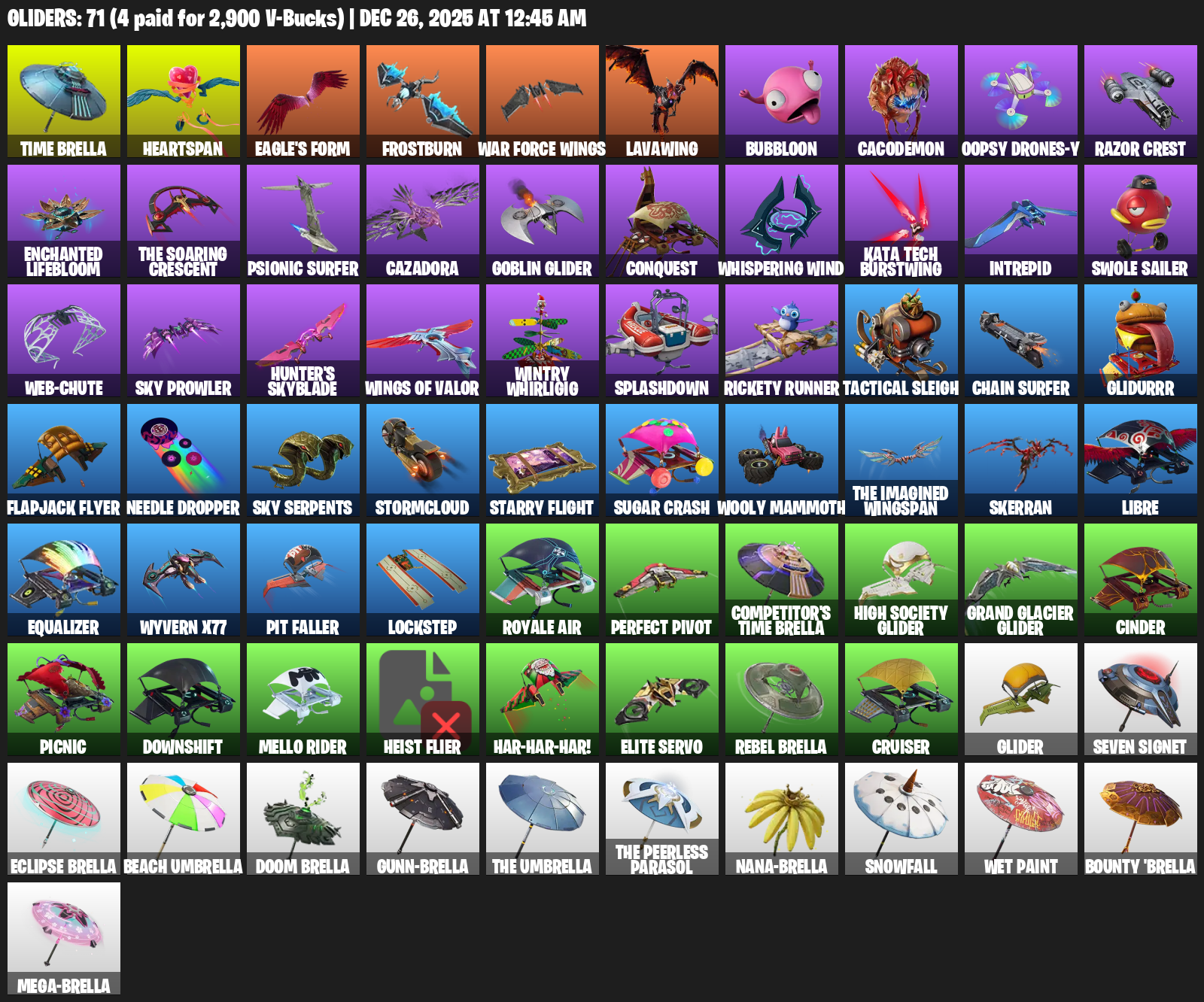 Time Brella, Heartspan, Eagle’s Form, Frostburn, War Force Wings, Lavawing, Bubbloon, Cacodemon, Oopsy Drones-y, Razor Crest, Enchanted Lifebloom, Psionic Surfer, Cazadora, Goblin Glider, Conquest, Whispering Wind, Kata Tech Burstwing, Intrepid, Swole Sailer