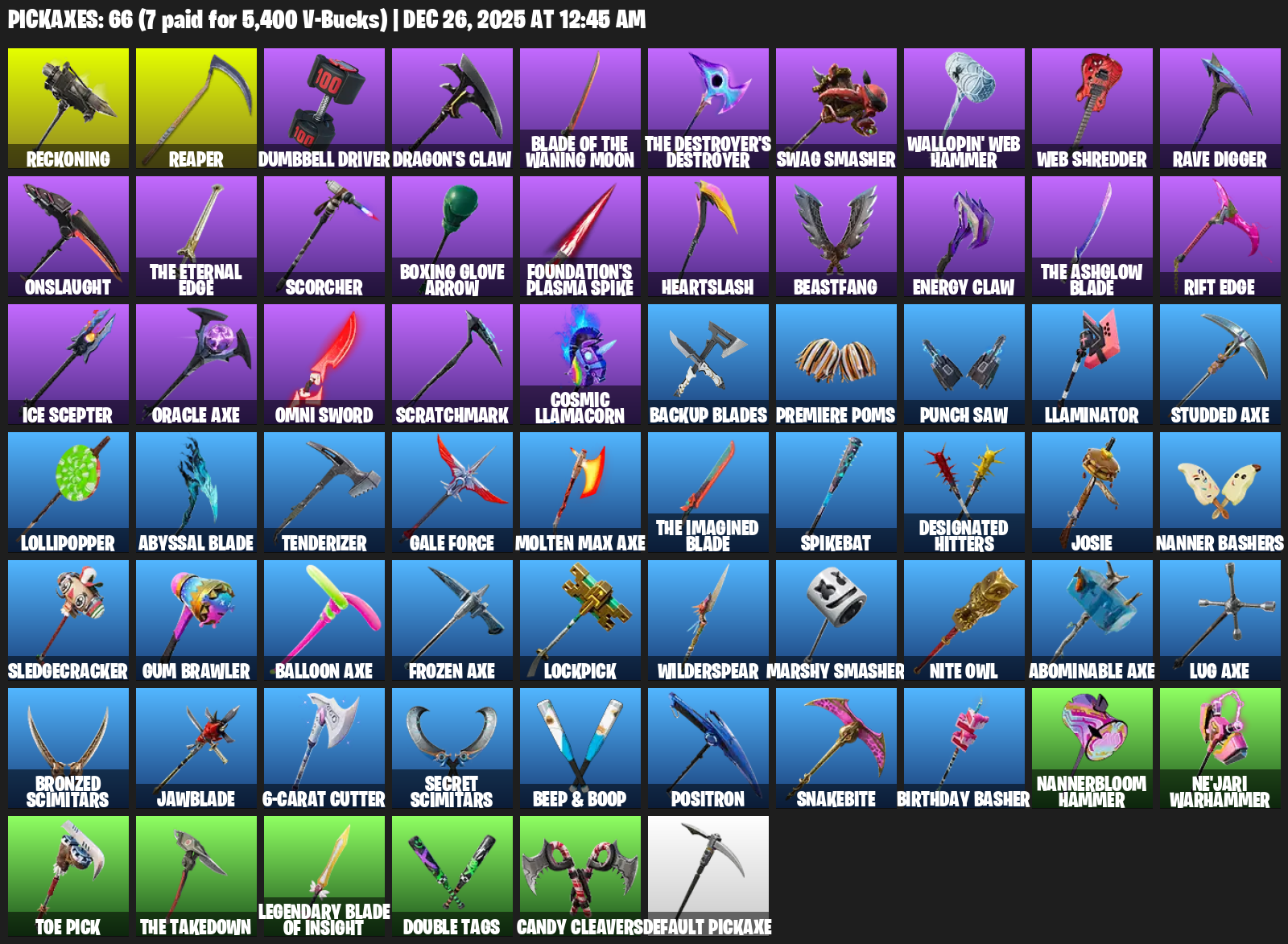 Reckoning, Reaper, Dumbbell Driver, Dragon’s Claw, Swag Smasher, Wallopin’ Web Hammer, Rave Digger, Onslaught, Scorcher, Boxing Glove Arrow, Foundation’s Plasma Spike, Heartslash, Beastfang, Rift Edge