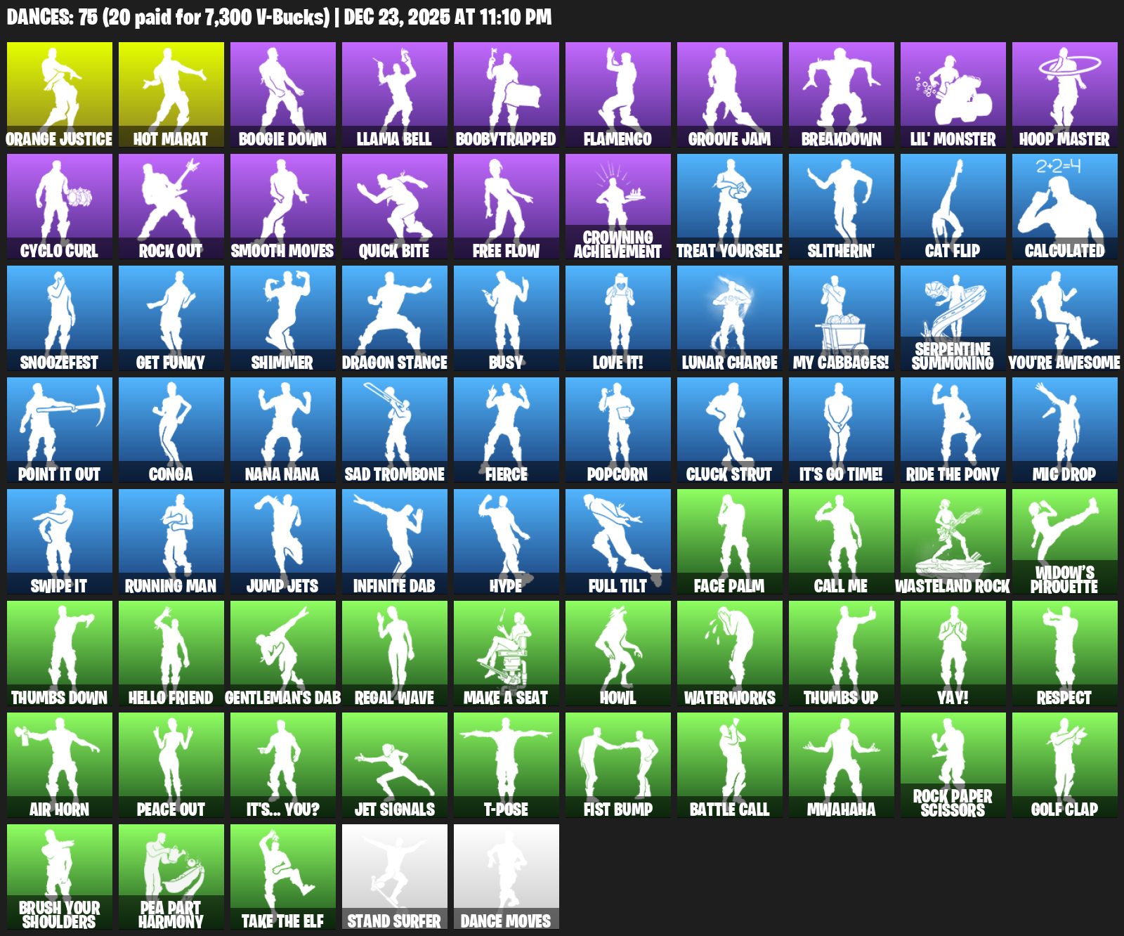 Hot Marat, Orange Justice, Boogie Down, Llama Bell, Boobytrapped, Flamenco, Groove Jam, Breakdown, Lil’ Monster, Hoop Master, Cyclo Curl, Rock Out, Smooth Moves, Quick Bite, Free Flow, Crowning Achievement, Treat Yourself, Slitherin’, Cat Flip, Calculated