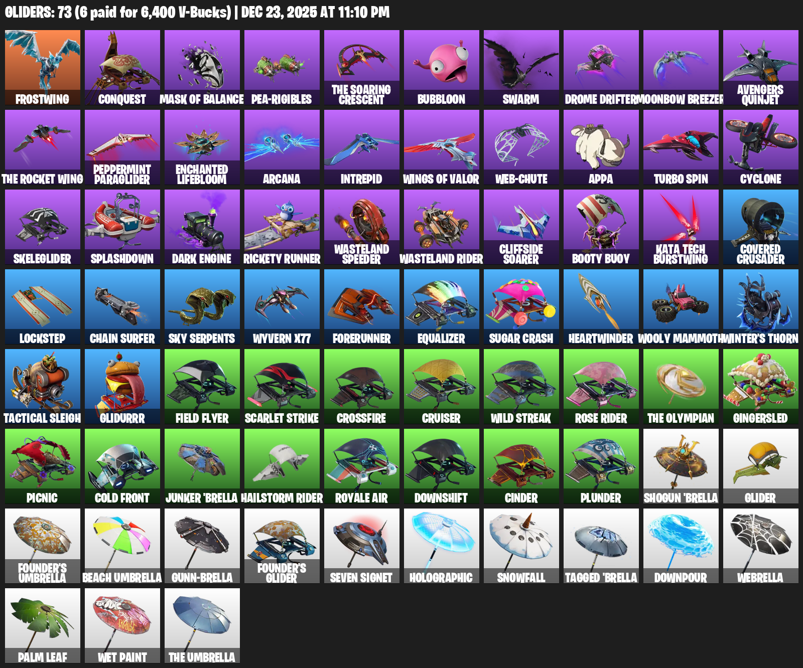 Frostwing, Conquest, Mask of Balance, Pea-rigibles, Bubbloon, Swarm, Drome Drifter, Moonbow Breezer, Avengers Quinjet, Peppermint Paraglider, Enchanted Lifebloom, Arcana, Intrepid, Appa, Turbo Spin, Cyclone
