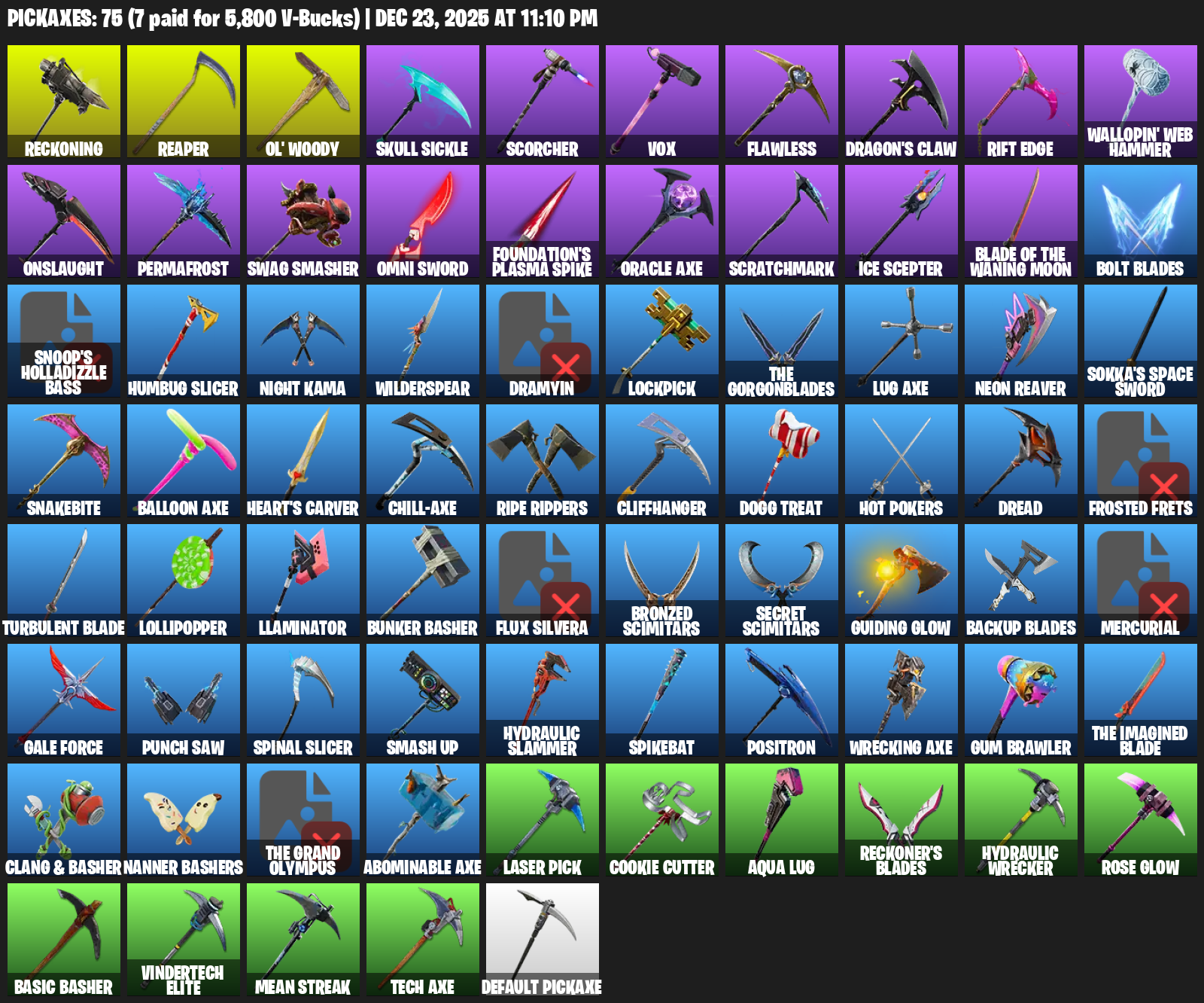 Reckoning, Reaper, Ol’ Woody, Skull Sickle, Scorcher, Vox, Flawless, Dragon’s Claw, Rift Edge, Wallopin’ Web Hammer, Onslaught, Permafrost, Swag Smasher, Omni Sword, Foundation’s Plasma Spike, Oracle Axe, Scratchmark, Bolt Blades