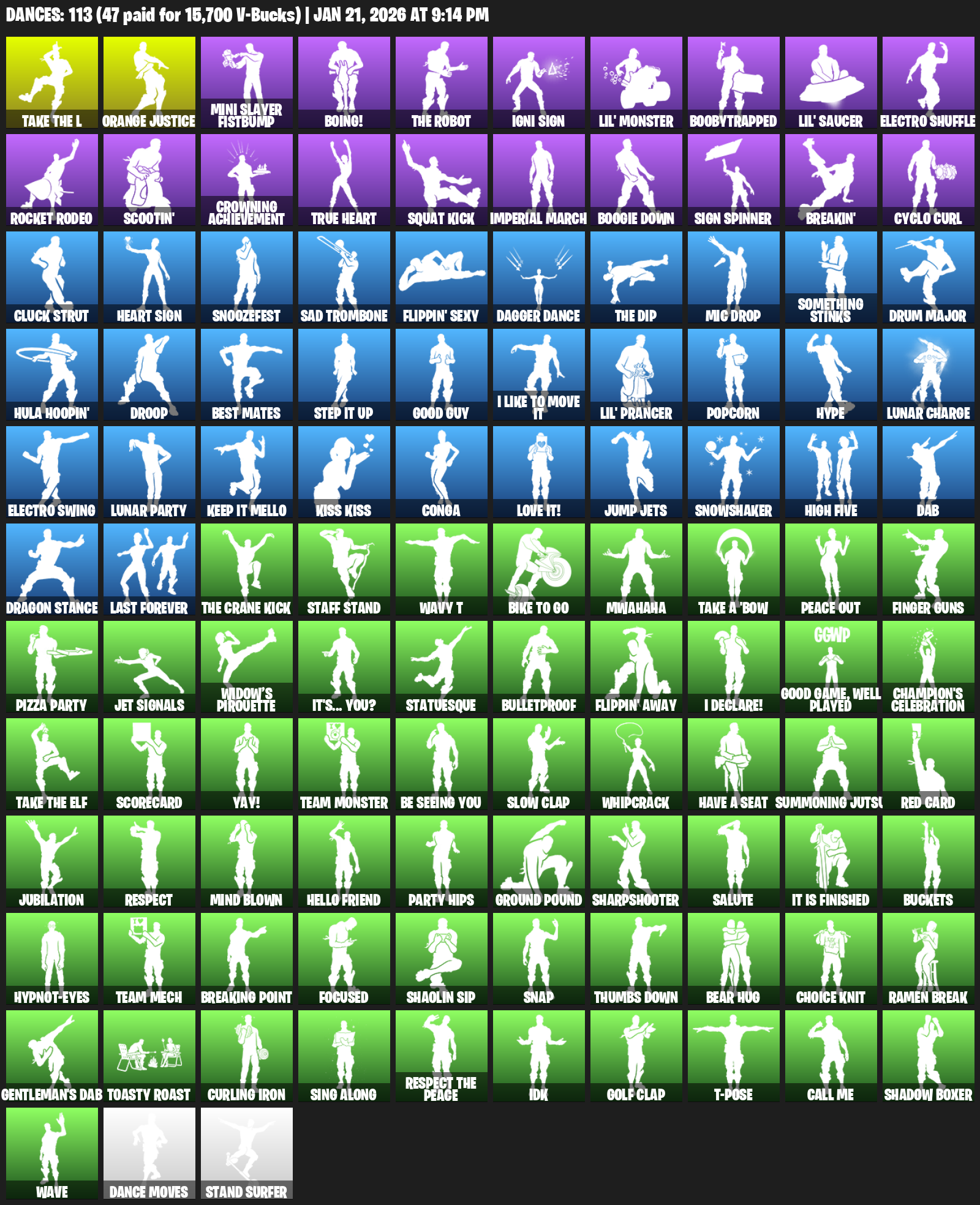 Orange Justice, Mini Slayer Fistbump, Boing!, Igni Sign, Lil’ Monster, Boobytrapped, Electro Shuffle, Rocket Rodeo, Scootin’, Crowning Achievement, True Heart, Squat Kick, Imperial March, Boogie Down, Breakin’, Cyclo Curl