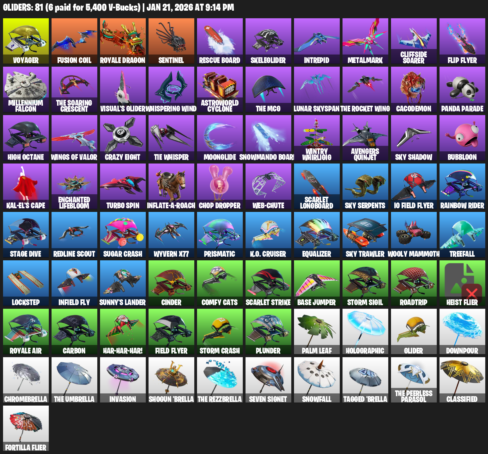 Royale Dragon, Rescue Board, Skeleglider, Intrepid, Metalmark, Cliffside Soarer, Flip Flyer, Millennium Falcon, Visual’s Glider, Whispering Wind, Astroworld Cyclone, Lunar Skyspan, Cacodemon, Panda Parade