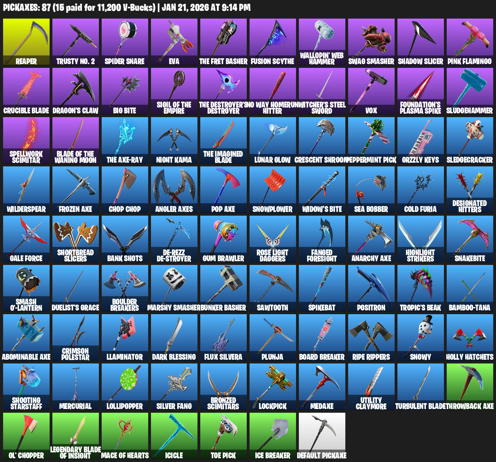 Trusty No. 2, Spider Snare, EVA, Wallopin’ Web Hammer, Swag Smasher, Shadow Slicer, Pink Flamingo, Crucible Blade, Dragon’s Claw, Big Bite, No Way Homerun Hitter, Witcher’s Steel Sword, Vox, Foundation’s Plasma Spike, Sludgehammer