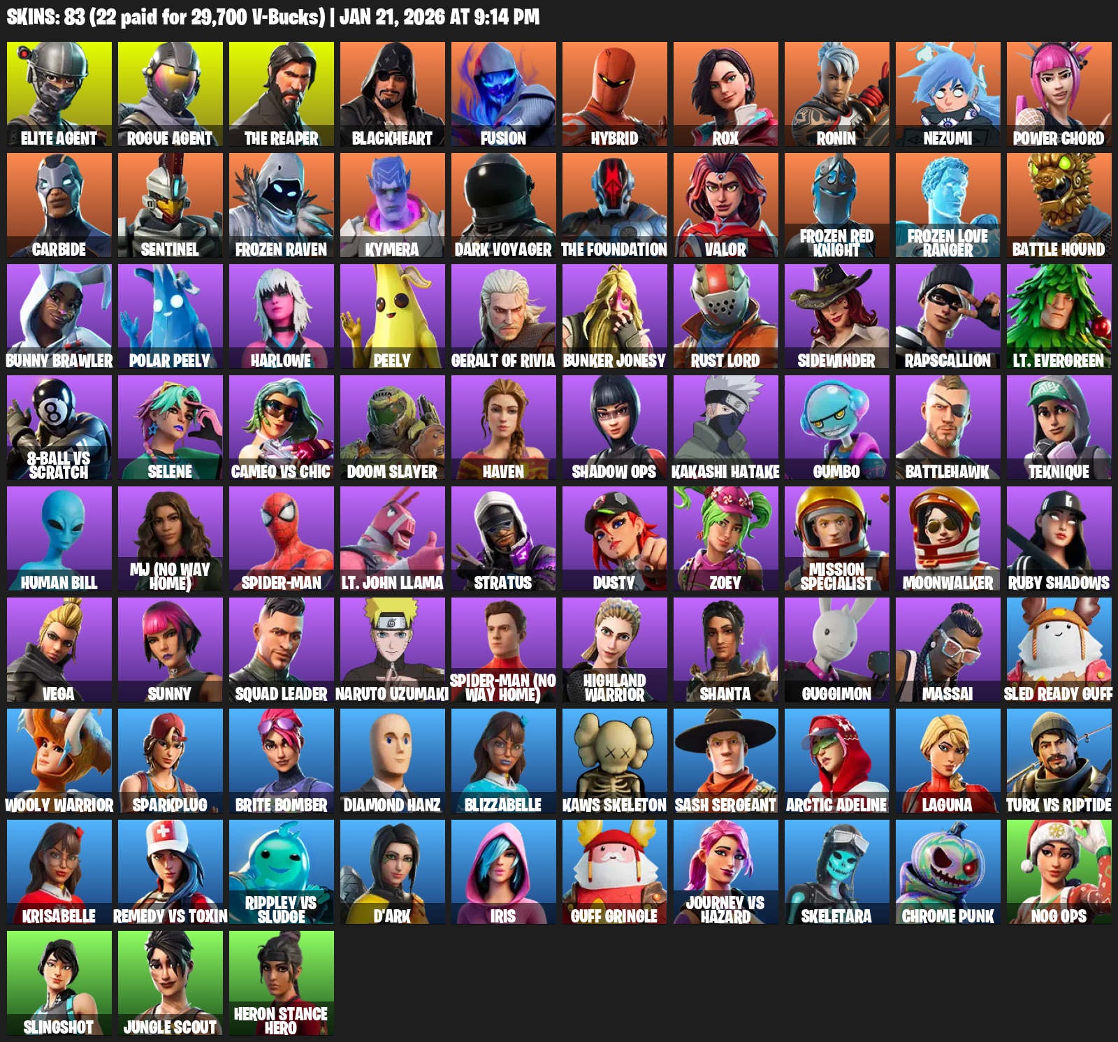 Elite Agent, The Reaper, Blackheart, Fusion, Hybrid, Rox, Ronin, Nezumi, Power Chord, Carbide, Sentinel, Frozen Raven, Kymera, Dark Voyager, Valor, Battle Hound