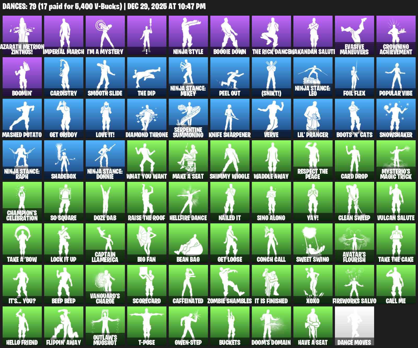 Azarath Metrion Zinthos!, Imperial March, I’m a Mystery, !, Ninja Style, Boogie Down, Wakandan Salute, Evasive Maneuvers, Crowning Achievement, Boomin’, Cardistry, Smooth Slide, Peel Out, (Snikt!), Foil Flex, Popular Vibe