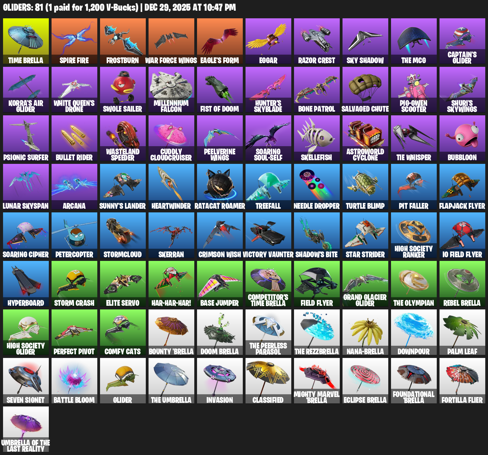 Time Brella, Frostburn, War Force Wings, Eagle’s Form, Eggar, Razor Crest, Sky Shadow, Captain’s Glider, White Queen’s Drone, Swole Sailer, Millennium Falcon, Fist of Doom, Hunter’s Skyblade, Bone Patrol, Salvaged Chute, Pig-Gwen Scooter, Shuri’s Skywings