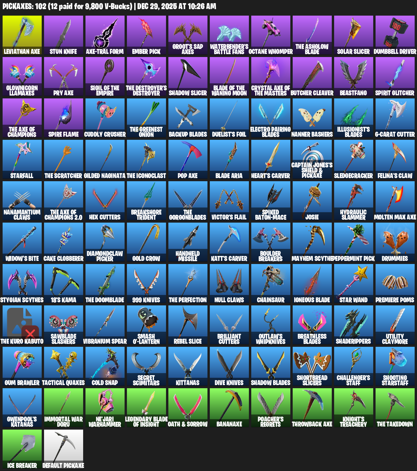 Leviathan Axe, Stun Knife, Ember Pick, Groot’s Sap Axes, Waterbender’s Battle Fans, Octane Whomper, Solar Slicer, Dumbbell Driver, Glownicorn Llamaxes, Butcher Cleaver, Beastfang, Spirit Glitcher