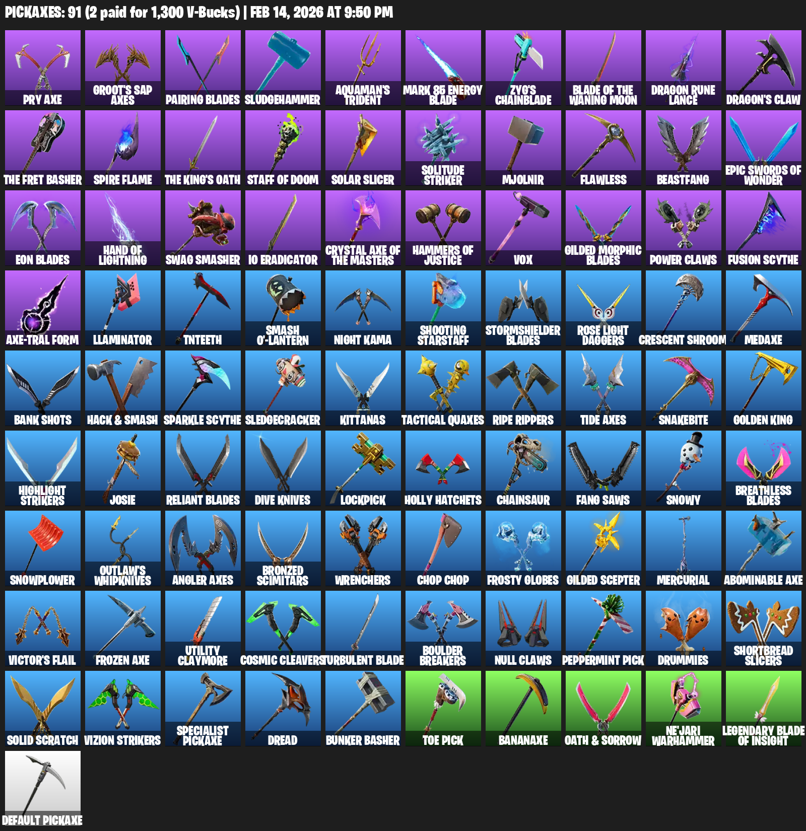 Pry Axe, Groot’s Sap Axes, Pairing Blades, Sludgehammer, Aquaman’s Trident, Mark 85 Energy Blade, Zyg’s Chainblade, Dragon Rune Lance, Dragon’s Claw, The Fret Basher, Staff of Doom, Solar Slicer, Solitude Striker, Mjolnir, Flawless, Beastfang