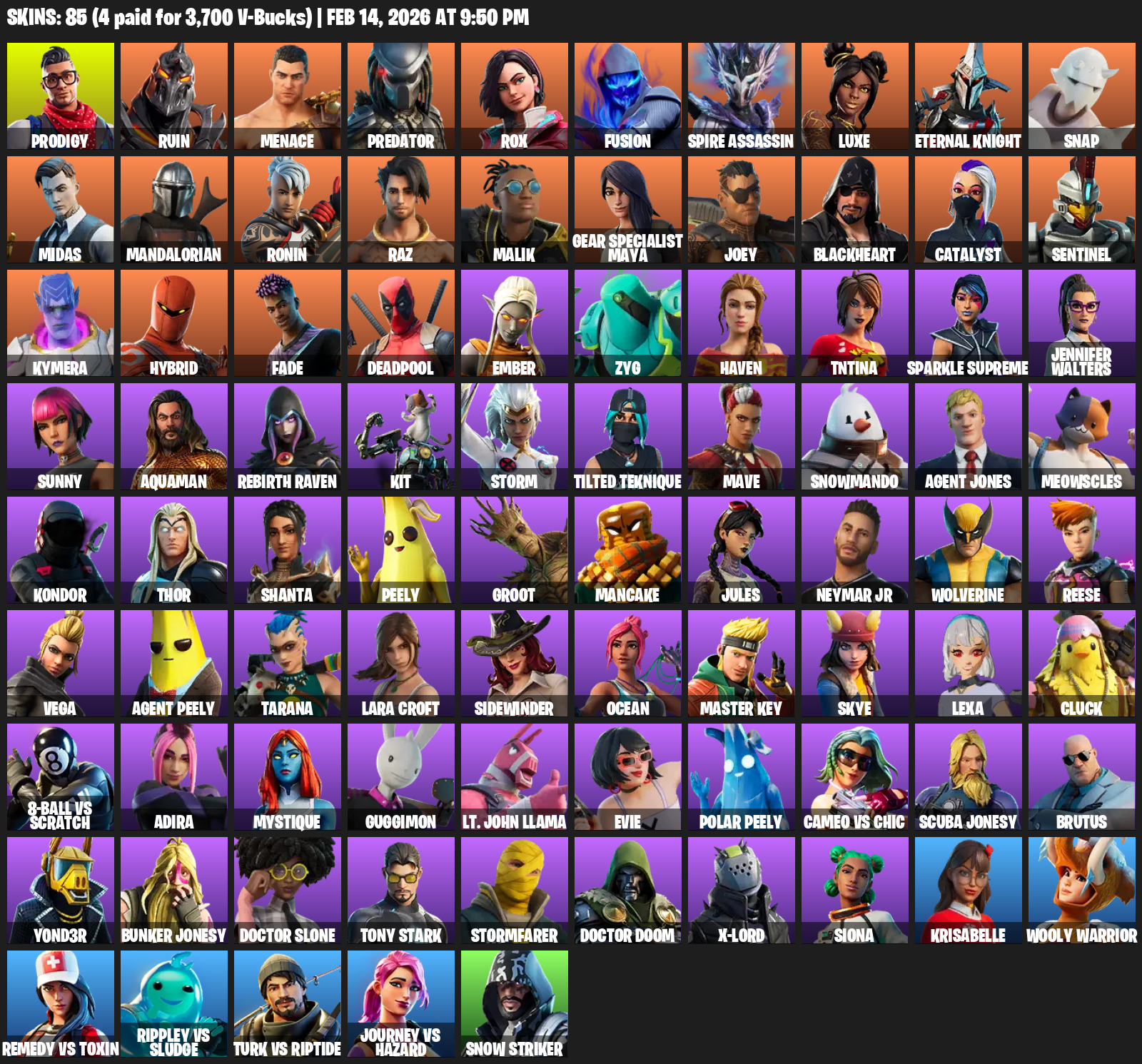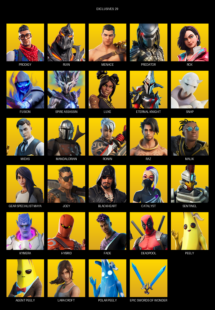 Gear Specialist Maya, Lara Croft, Prodigy, Ruin, Menace, Predator, Rox, Fusion, Spire Assassin, Luxe, Eternal Knight, Snap, Midas, Mandalorian, Ronin, Raz, Malik, Joey, Blackheart, Catalyst