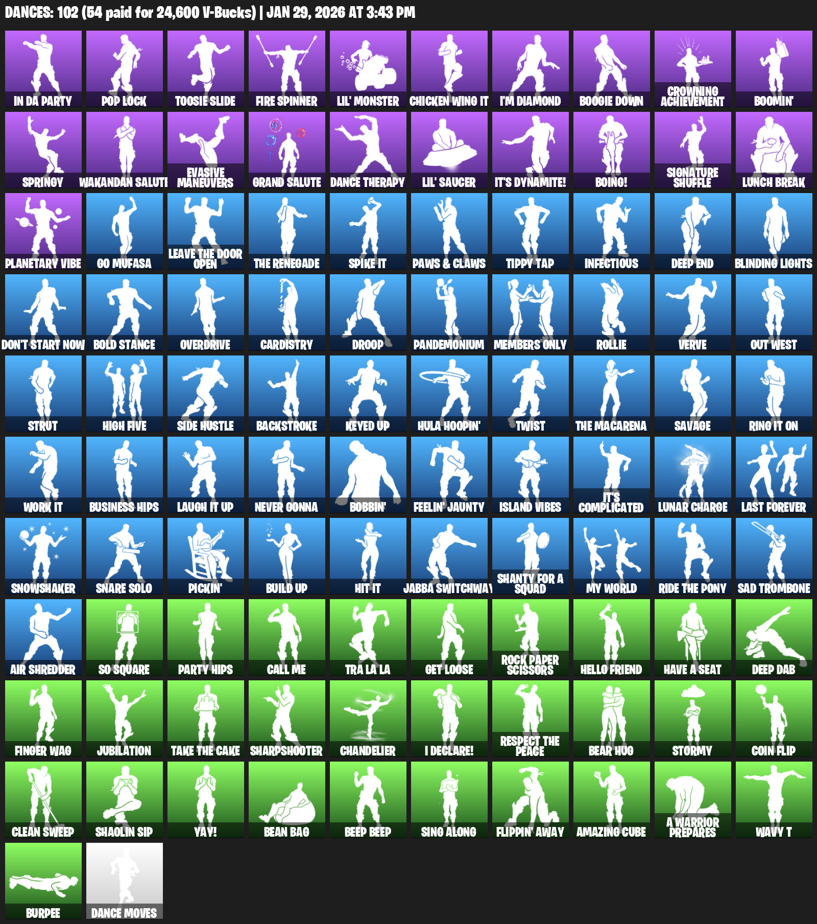 In Da Party, Pop Lock, Toosie Slide, Fire Spinner, Lil’ Monster, Chicken Wing It, I’m Diamond, Boogie Down, Crowning Achievement, Boomin’, Springy, Wakandan Salute, Evasive Maneuvers, Dance Therapy, It’s Dynamite!, Boing!, Signature Shuffle, Lunch Break