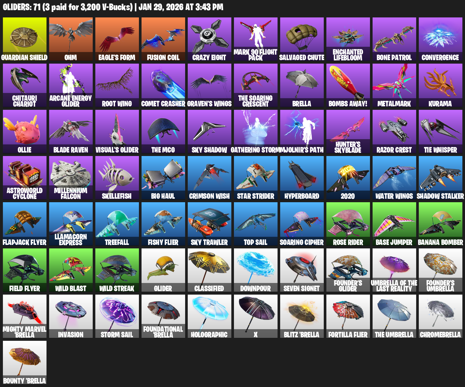 Guardian Shield, Ohm, Eagle’s Form, Crazy Eight, Mark 90 Flight Pack, Salvaged Chute, Enchanted Lifebloom, Bone Patrol, Convergence, Chitauri Chariot, Arcane Energy Glider, Comet Crasher, Graven’s Wings, Brella, Bombs Away!, Metalmark, Kurama