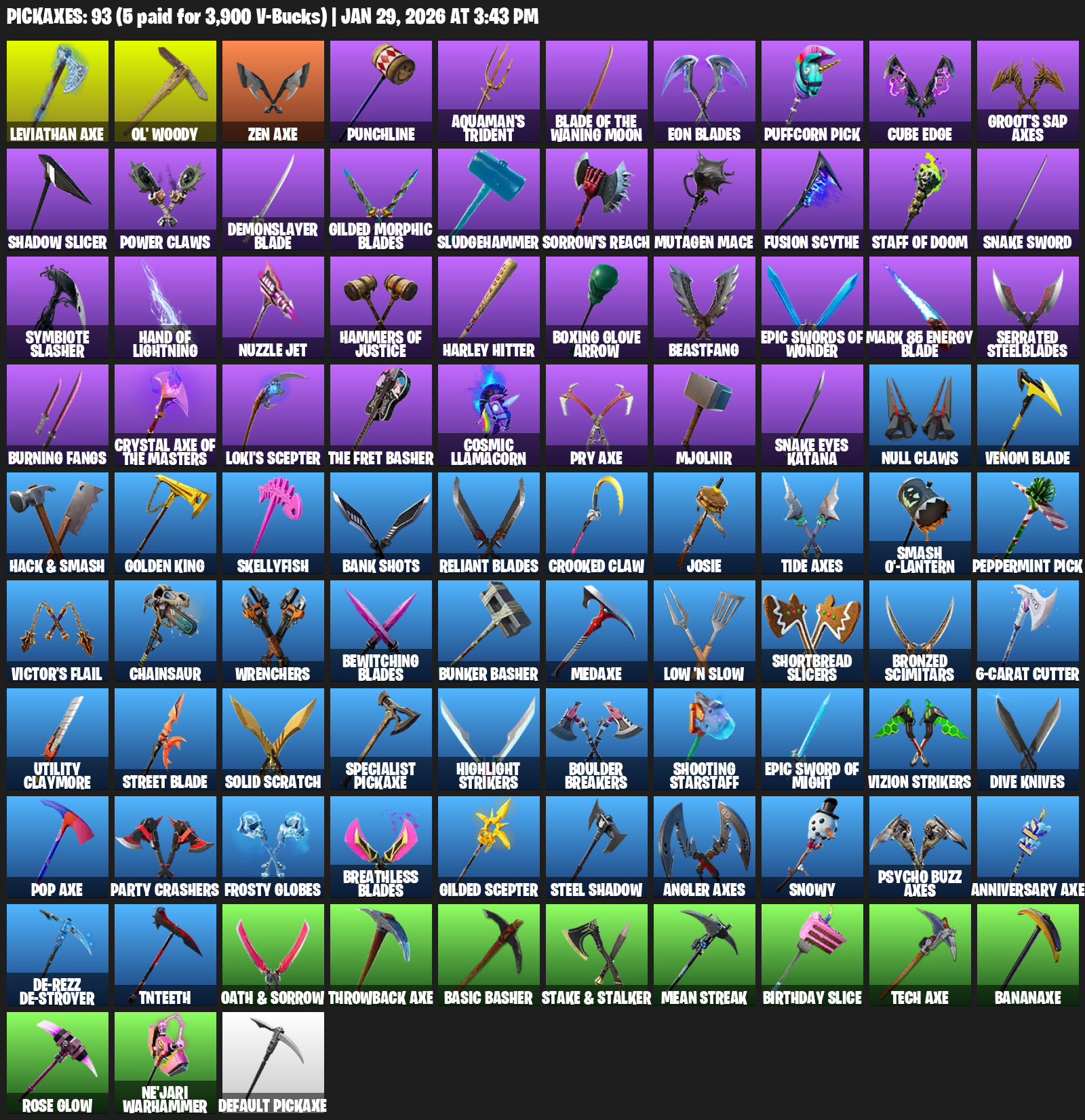 Leviathan Axe, Ol’ Woody, Punchline, Aquaman’s Trident, Eon Blades, Puffcorn Pick, Groot’s Sap Axes, Shadow Slicer, Power Claws, Demonslayer Blade, Sludgehammer, Sorrow’s Reach, Mutagen Mace, Staff of Doom, Snake Sword