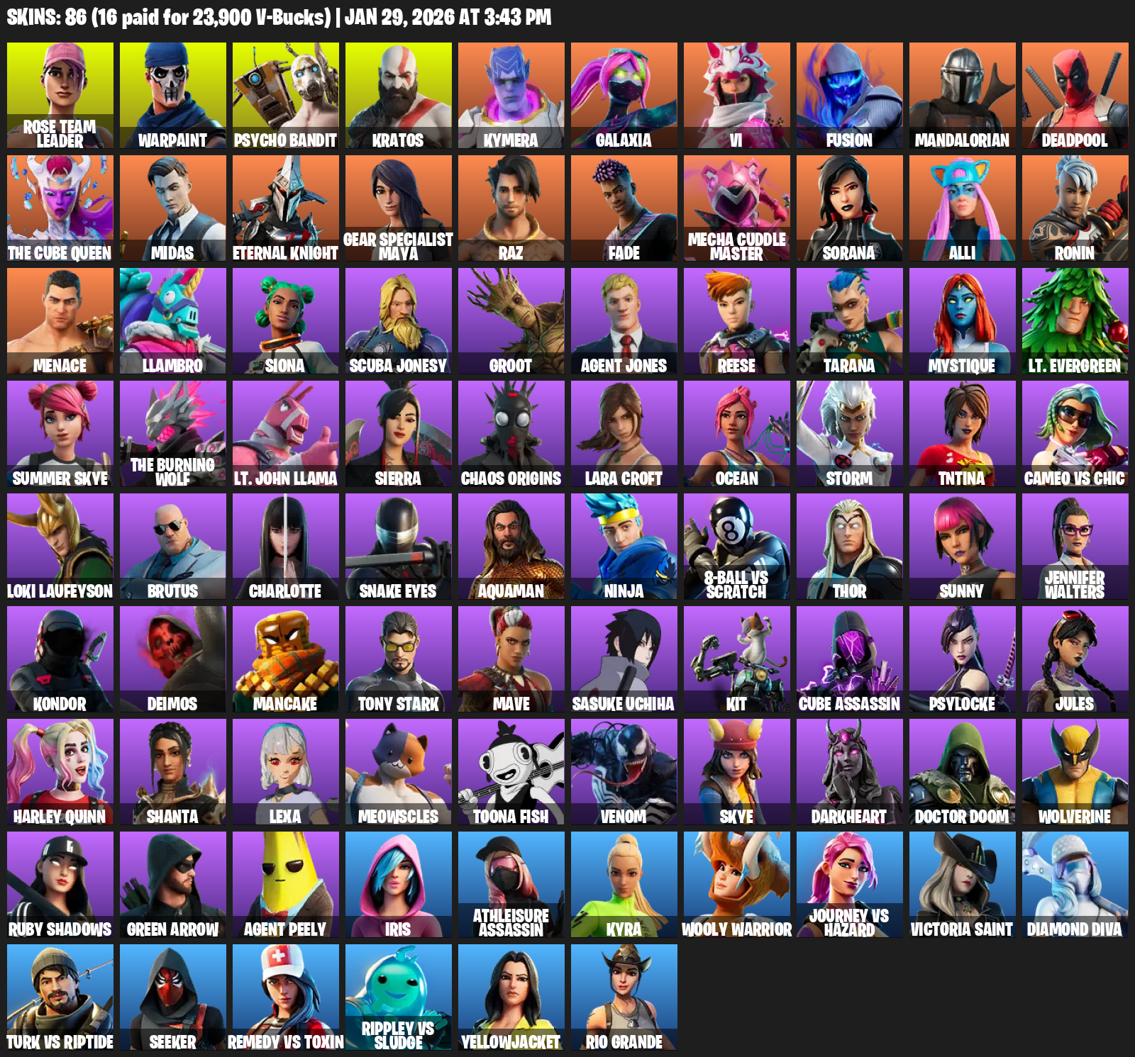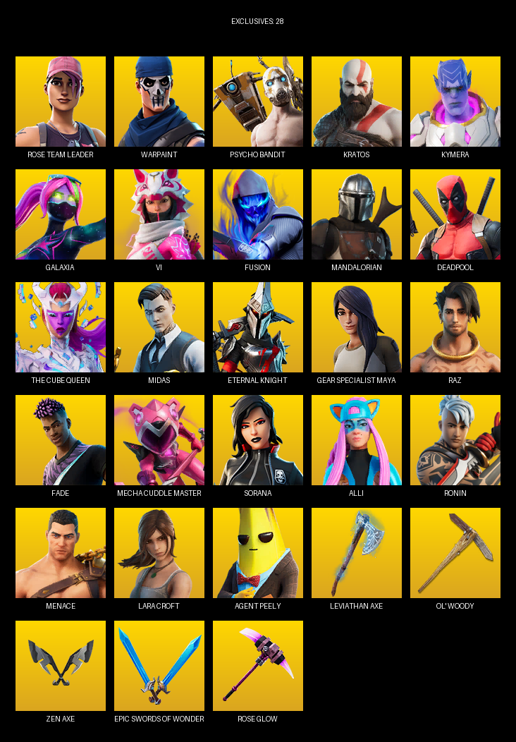 Gear Specialist Maya, Lara Croft, Rose Team Leader, Warpaint, Psycho Bandit, Kratos, Kymera, Galaxia, Vi, Fusion, Mandalorian, Deadpool, The Cube Queen, Midas, Eternal Knight, Raz, Fade, Mecha Cuddle Master, Sorana, Alli