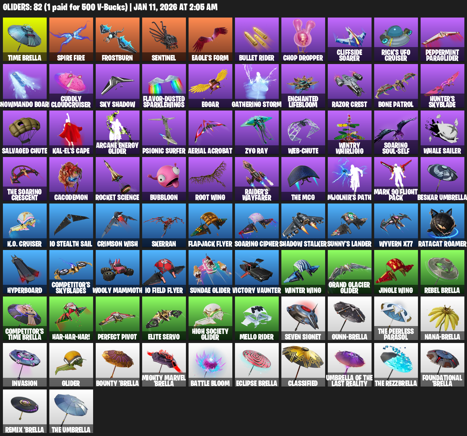 Time Brella, Frostburn, Sentinel, Bullet Rider, Chop Dropper, Cliffside Soarer, Rick’s UFO Cruiser, Peppermint Paraglider, Snowmando Board, Cuddly Cloudcruiser, Sky Shadow, Flavor-Dusted Sparklewings, Eggar, Gathering Storm, Enchanted Lifebloom, Razor Crest, Bone Patrol, Hunter’s Skyblade