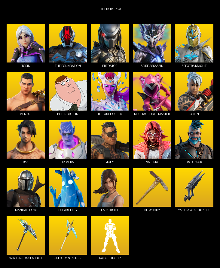 Lara Croft, Torin, The Foundation, Predator, Spire Assassin, Spectra Knight, Menace, Peter Griffin, Mecha Cuddle Master, Ronin, Raz, Kymera, Joey, Valeria, Omegarok, Mandalorian, Toona Fish, Kondor, Wolverine
