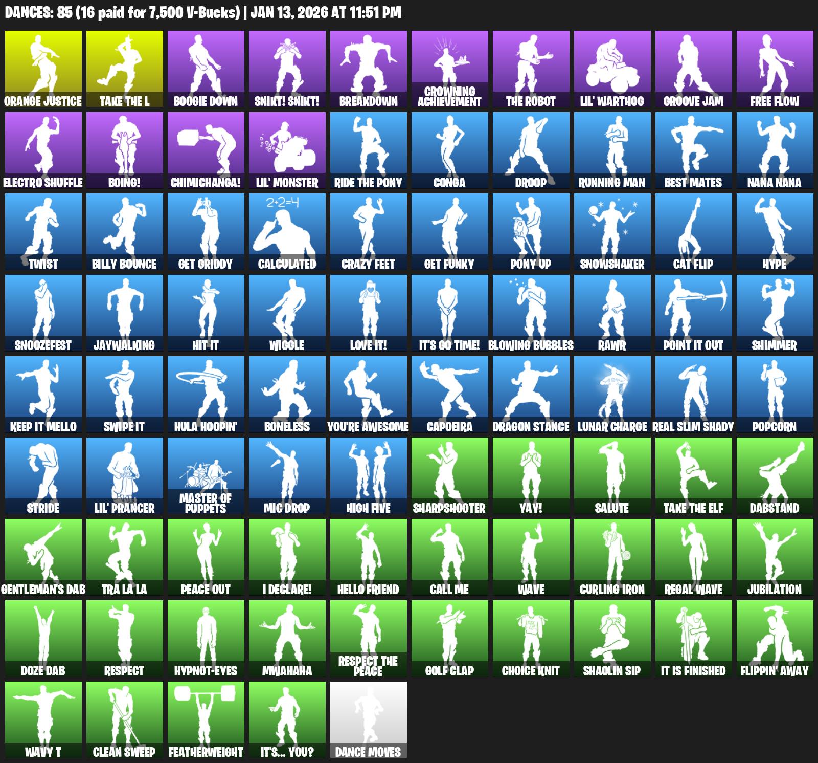 Orange Justice, Boogie Down, Snikt! Snikt!, Breakdown, Crowning Achievement, Lil’ Warthog, Groove Jam, Free Flow, Electro Shuffle, Boing!, Chimichanga!, Conga, Droop, Running Man, Best Mates, Nana Nana