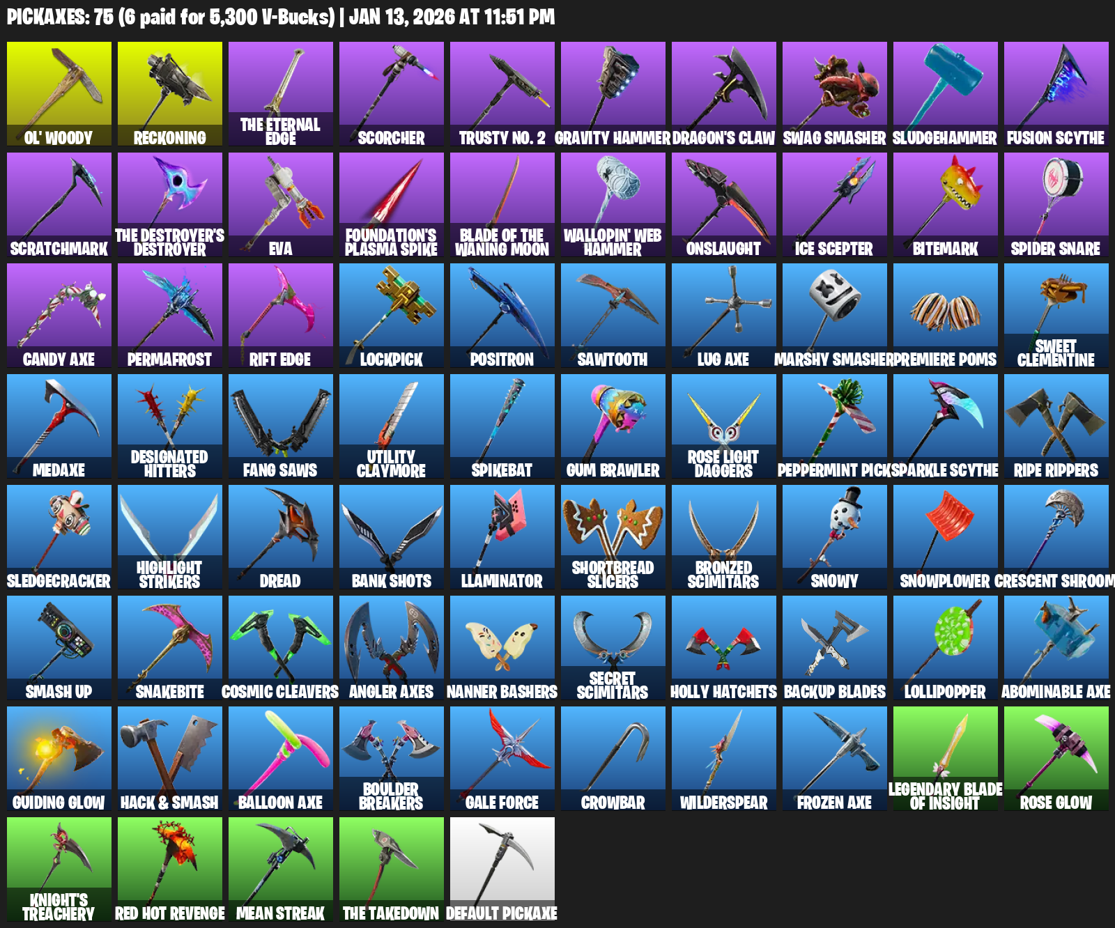 Ol’ Woody, Reckoning, Scorcher, Trusty No. 2, Gravity Hammer, Dragon’s Claw, Swag Smasher, Sludgehammer, Scratchmark, EVA, Foundation’s Plasma Spike, Onslaught, Ice Scepter, Bitemark, Spider Snare