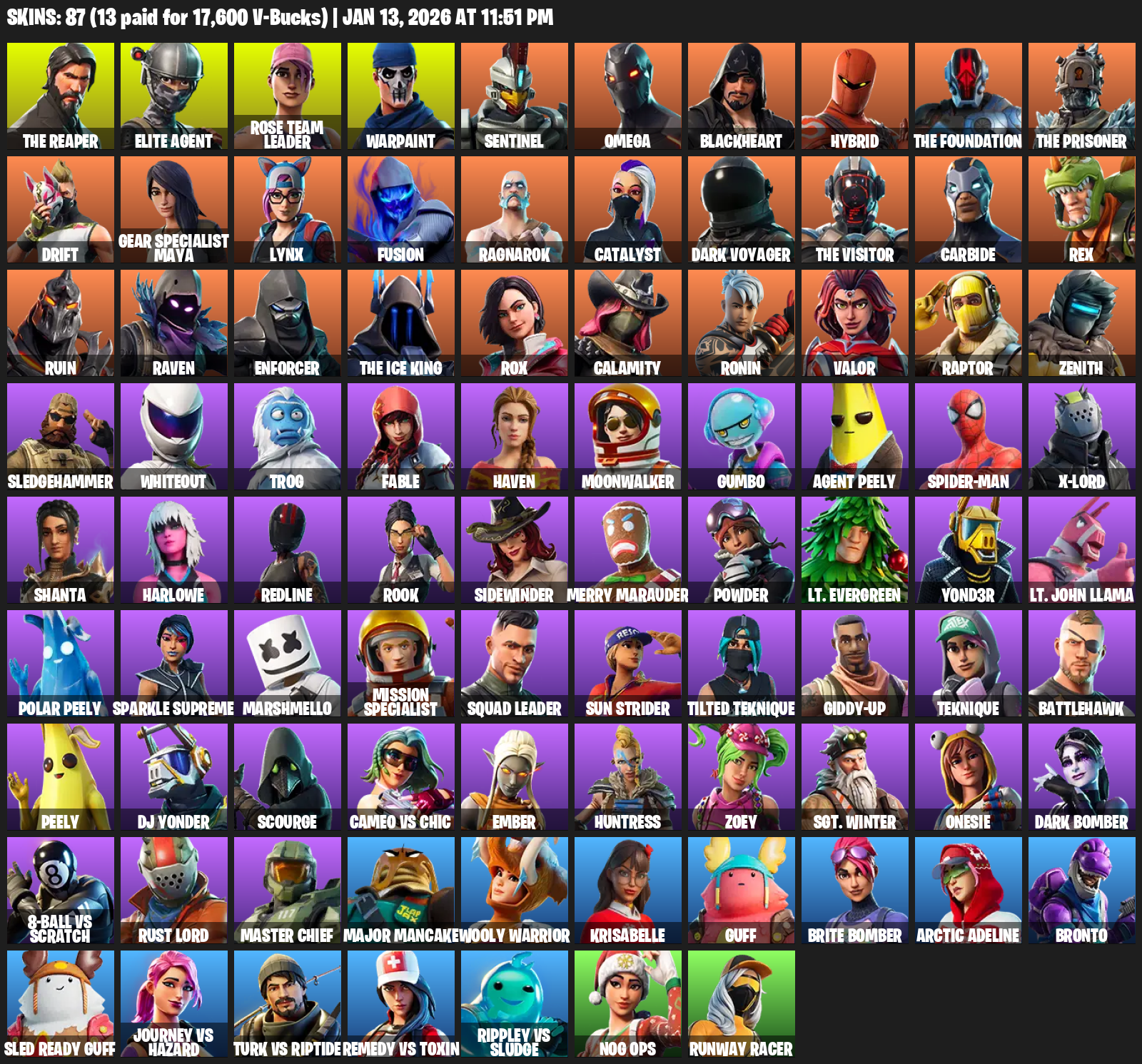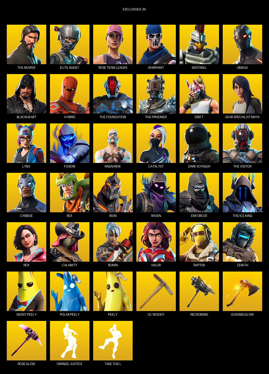 The Reaper, Elite Agent, Omega, Gear Specialist Maya, Rose Team Leader, Warpaint, Sentinel, Blackheart, Hybrid, Drift, Lynx, Fusion, Ragnarok, Catalyst, Dark Voyager, Carbide, Rex