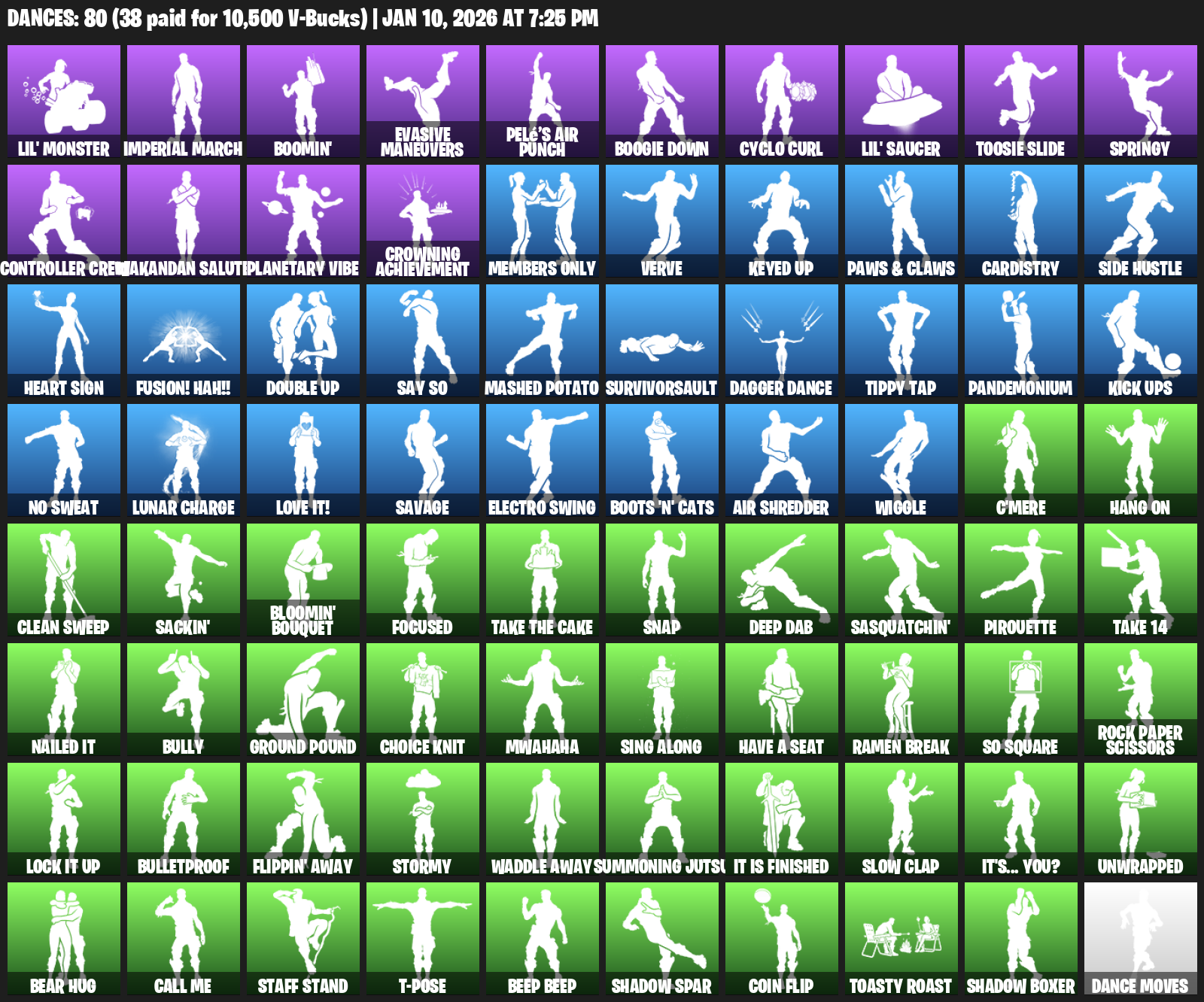 Lil’ Monster, Imperial March, Boomin’, Evasive Maneuvers, Pelé’s Air Punch, Boogie Down, Cyclo Curl, Toosie Slide, Springy, Controller Crew, Wakandan Salute, Planetary Vibe, Crowning Achievement, Members Only, Verve, Keyed Up, Cardistry, Side Hustle