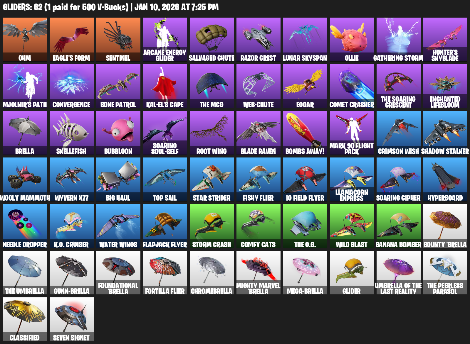 Ohm, Eagle’s Form, Sentinel, Salvaged Chute, Razor Crest, Lunar Skyspan, Ollie, Gathering Storm, Hunter’s Skyblade, Mjolnir’s Path, Convergence, Bone Patrol, Kal-El’s Cape, Eggar, Comet Crasher, Enchanted Lifebloom