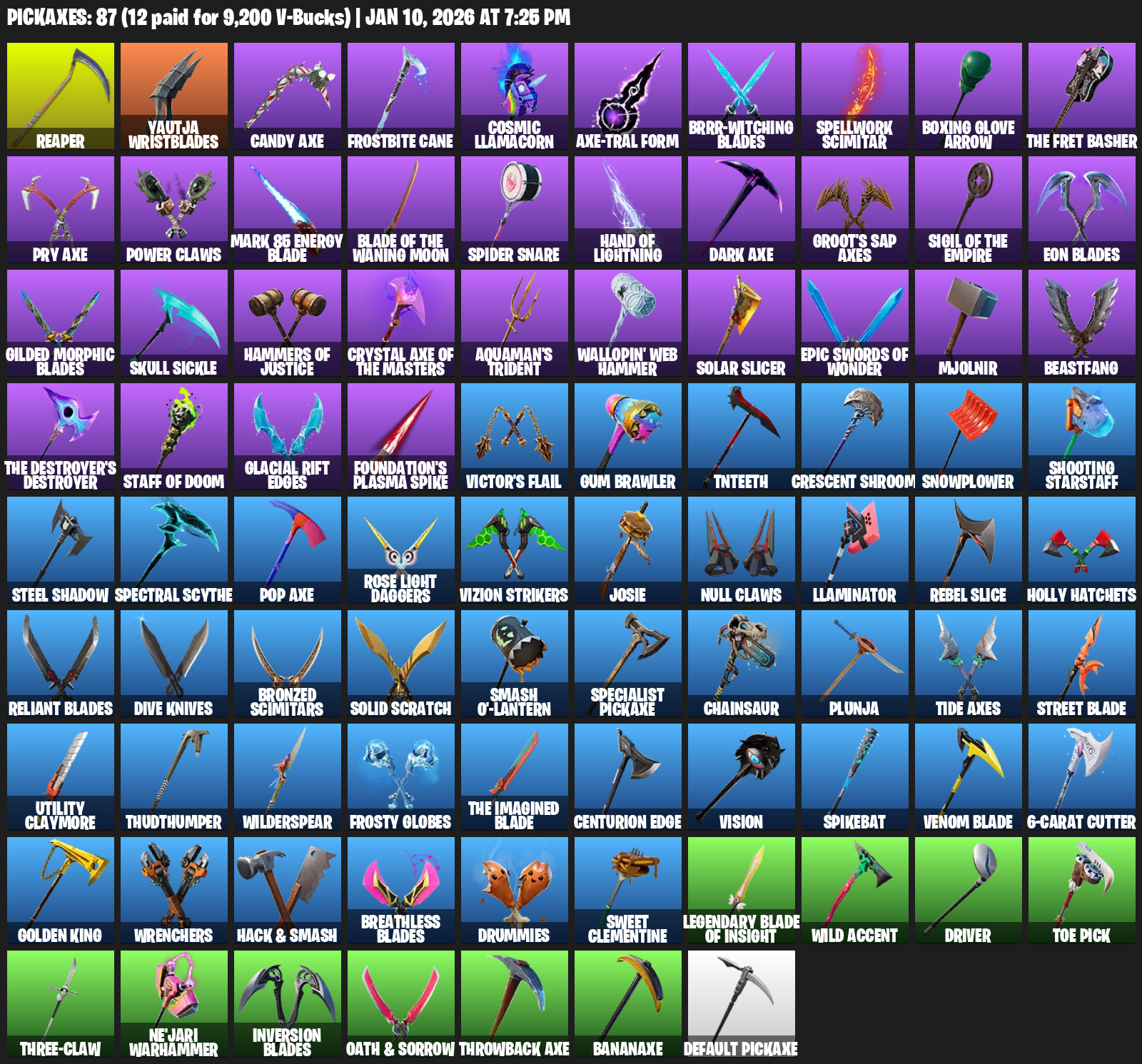 Reaper, Yautja Wristblades, Candy Axe, Frostbite Cane, Cosmic Llamacorn, Brrr-witching Blades, Spellwork Scimitar, Boxing Glove Arrow, Power Claws, Mark 85 Energy Blade, Hand of Lightning, Groot’s Sap Axes