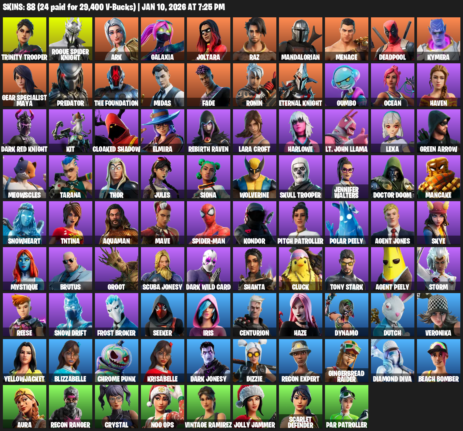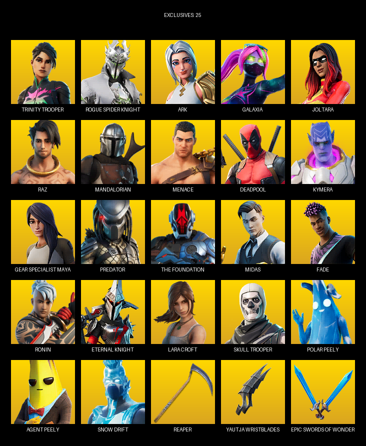 Gear Specialist Maya, Lara Croft, Trinity Trooper, Rogue Spider Knight, Ark, Galaxia, Joltara, Raz, Mandalorian, Menace, Deadpool, Kymera, Predator, The Foundation, Midas, Fade, Ronin, Gumbo, Ocean
