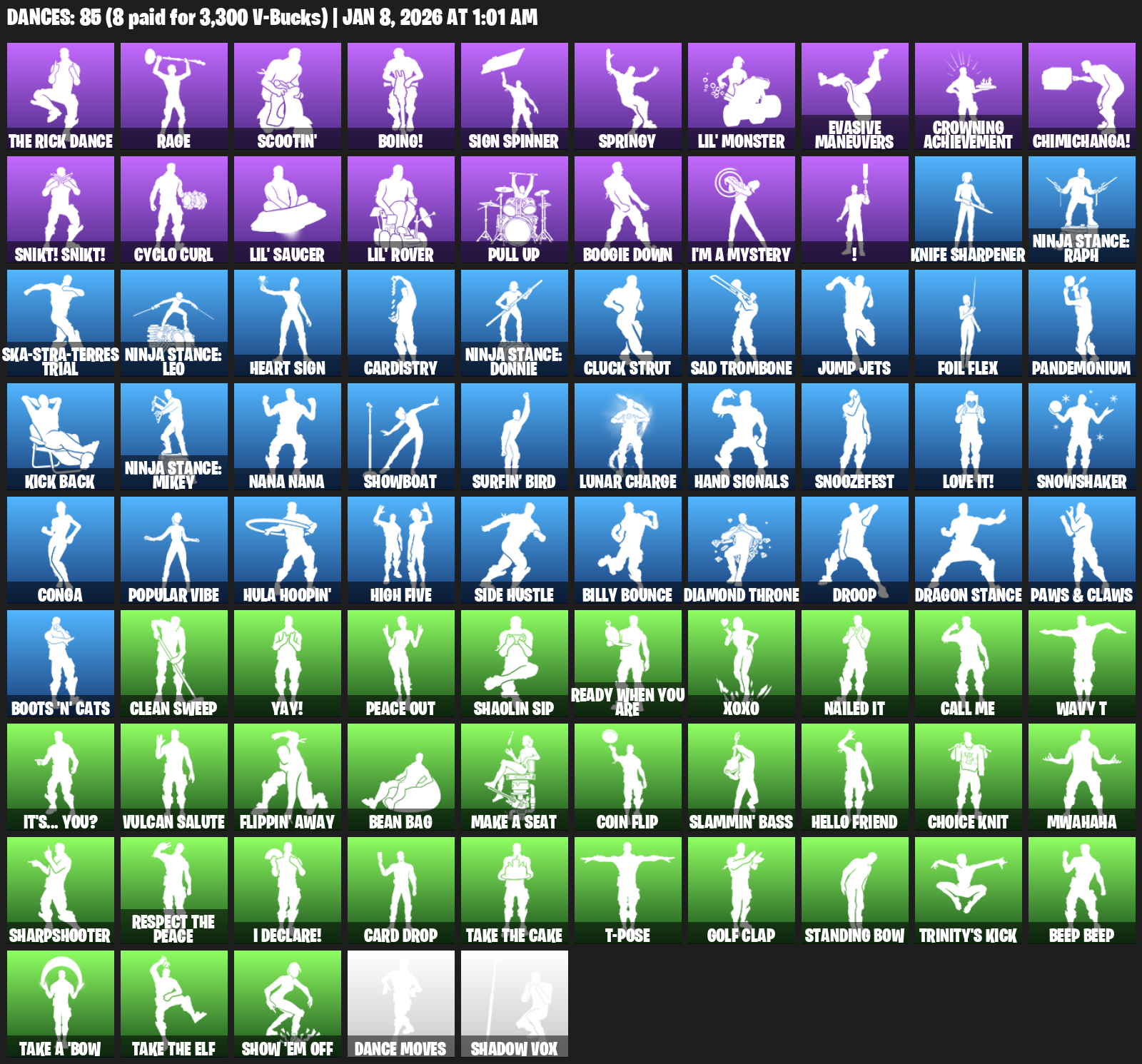 Rage, Scootin’, Boing!, Sign Spinner, Springy, Lil’ Monster, Evasive Maneuvers, Crowning Achievement, Chimichanga!, Snikt! Snikt!, Cyclo Curl, Pull Up, Boogie Down, I’m a Mystery, !, Ninja Stance: Raph