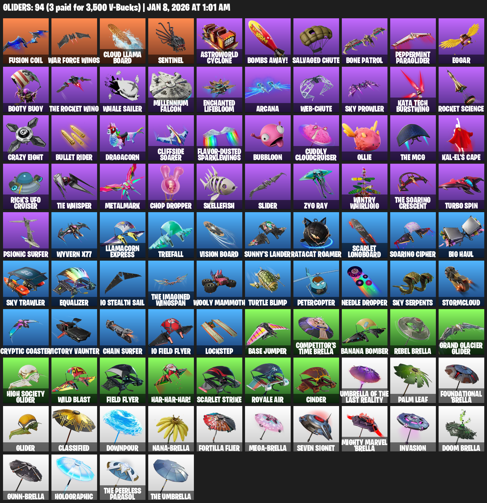 War Force Wings, Cloud Llama Board, Astroworld Cyclone, Bombs Away!, Salvaged Chute, Bone Patrol, Peppermint Paraglider, Eggar, Booty Buoy, Whale Sailer, Millennium Falcon, Enchanted Lifebloom, Arcana, Sky Prowler, Kata Tech Burstwing, Rocket Science