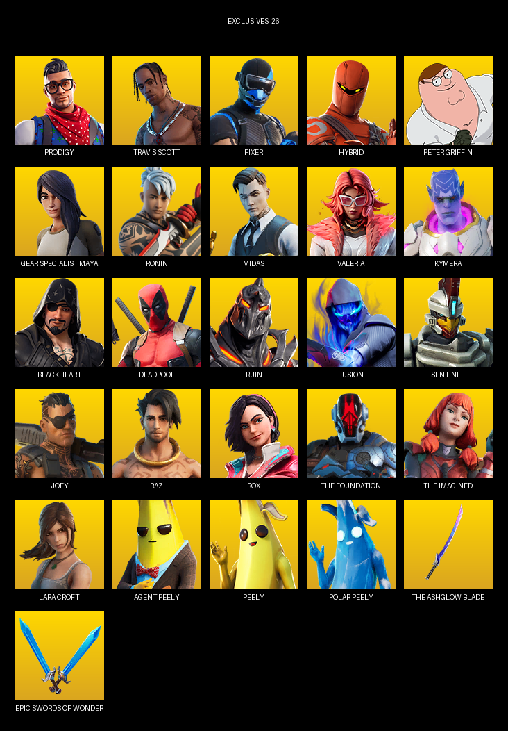 Travis Scott, Gear Specialist Maya, Lara Croft, Prodigy, Fixer, Hybrid, Peter Griffin, Ronin, Midas, Valeria, Kymera, Blackheart, Deadpool, Ruin, Fusion, Sentinel, Joey, Raz, Rox, The Foundation