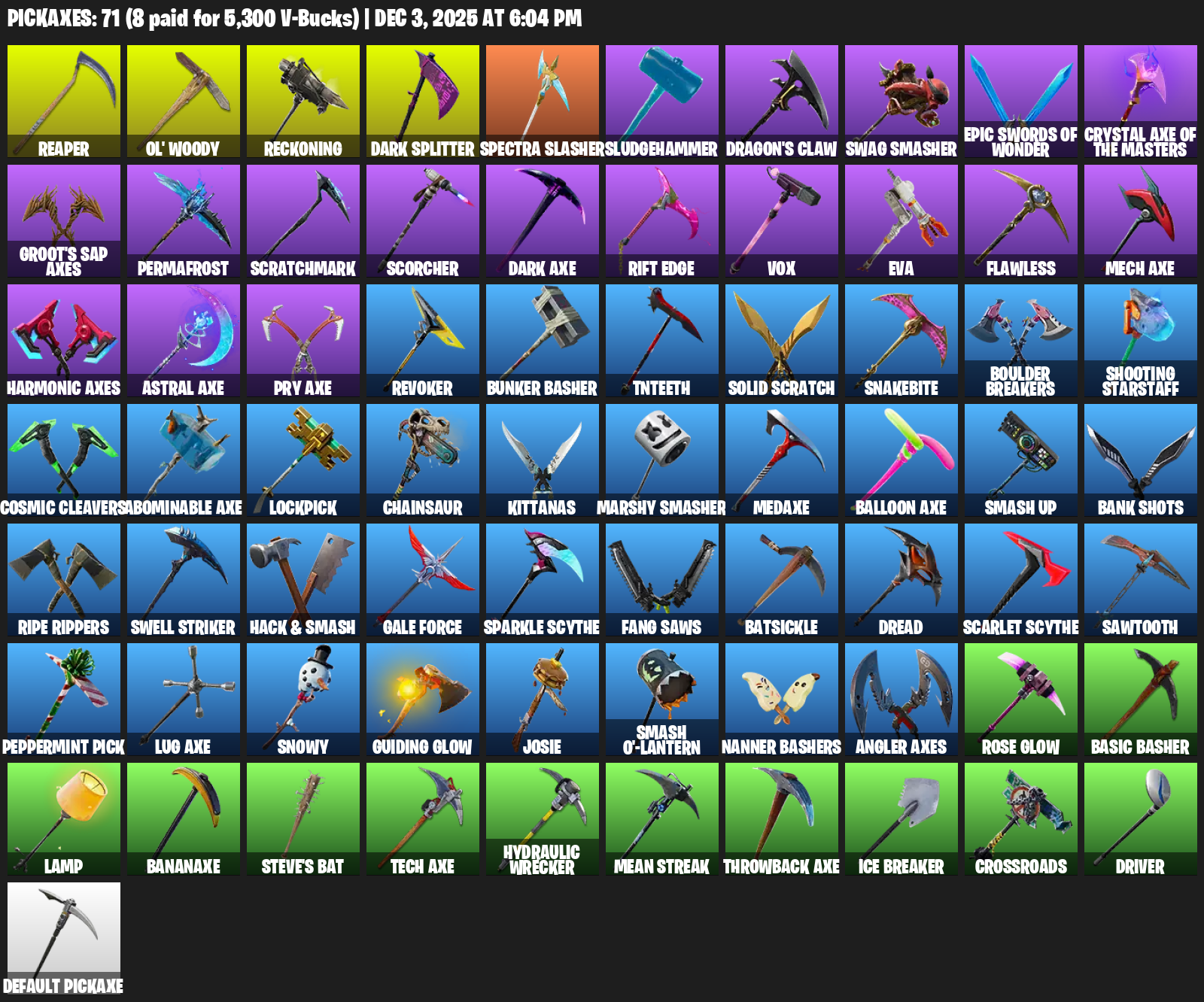 Reaper, Ol’ Woody, Reckoning, Sludgehammer, Dragon’s Claw, Swag Smasher, Groot’s Sap Axes, Permafrost, Scratchmark, Scorcher, Rift Edge, Vox, EVA, Flawless, Mech Axe