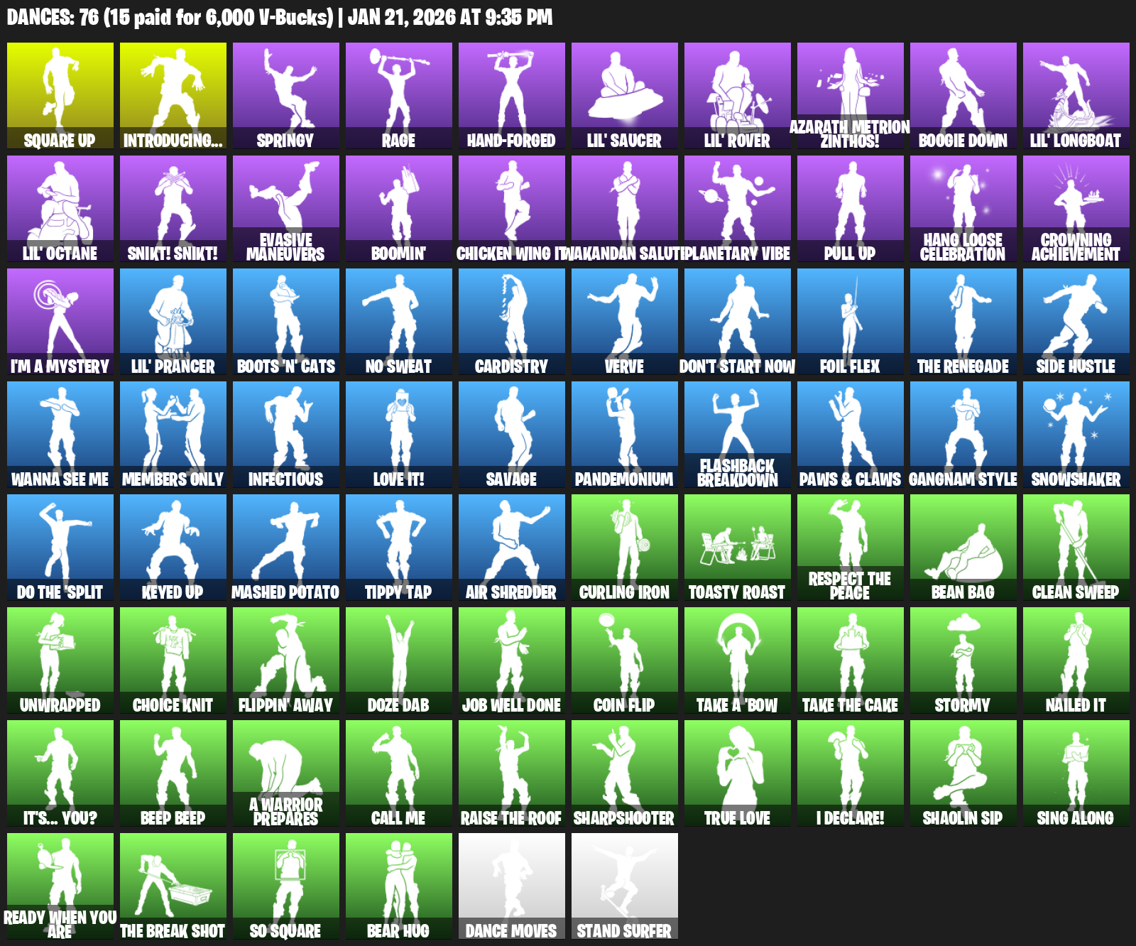 Introducing…, Square Up, Springy, Rage, Hand-Forged, Lil’ Saucer, Azarath Metrion Zinthos!, Boogie Down, Snikt! Snikt!, Evasive Maneuvers, Boomin’, Chicken Wing It, Wakandan Salute, Planetary Vibe, Hang Loose Celebration, Crowning Achievement