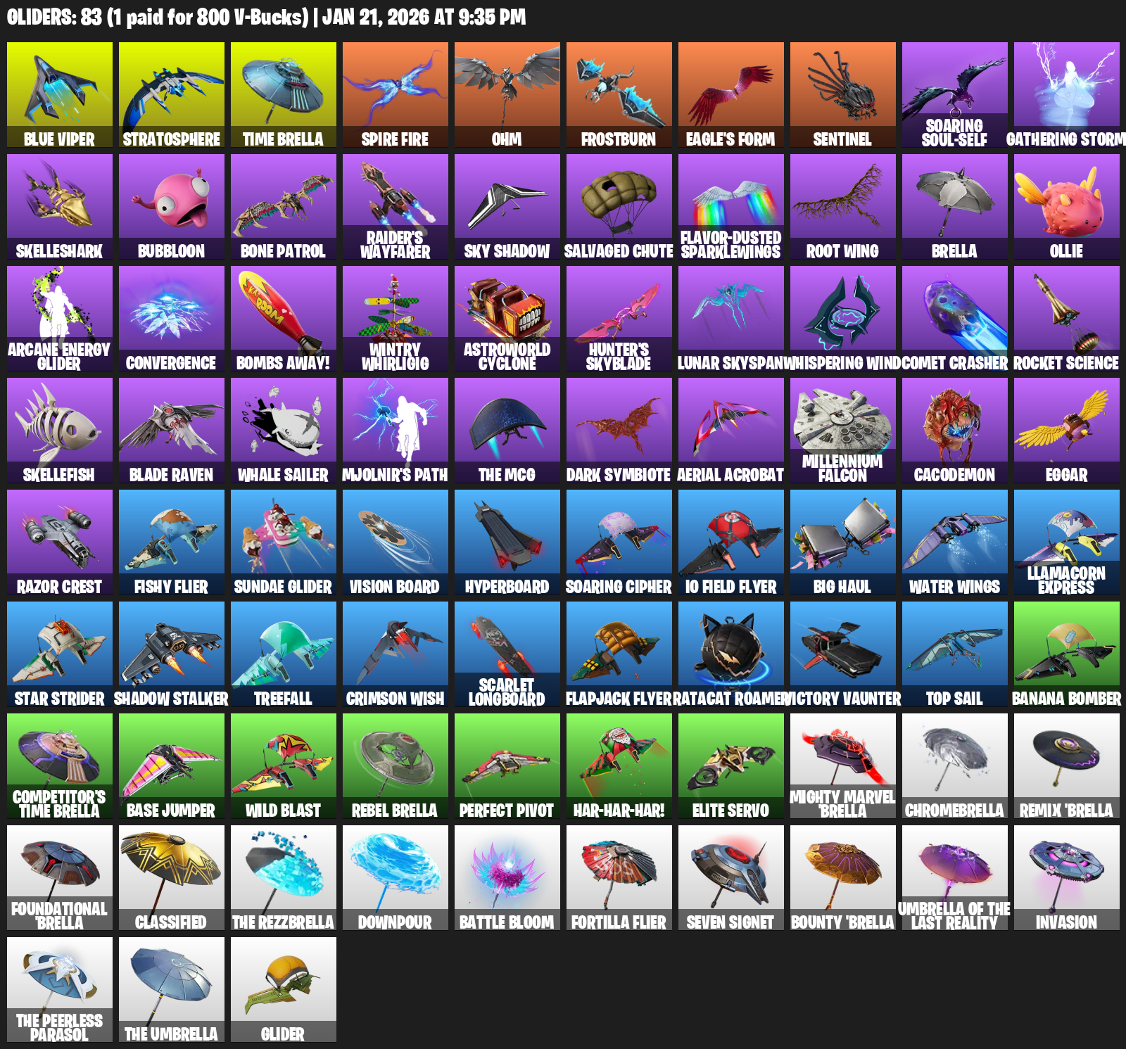 Blue Viper, Stratosphere, Time Brella, Ohm, Frostburn, Eagle’s Form, Sentinel, Soaring Soul-Self, Gathering Storm, Skelleshark, Bubbloon, Bone Patrol, Raider’s Wayfarer, Salvaged Chute, Flavor-Dusted Sparklewings, Ollie