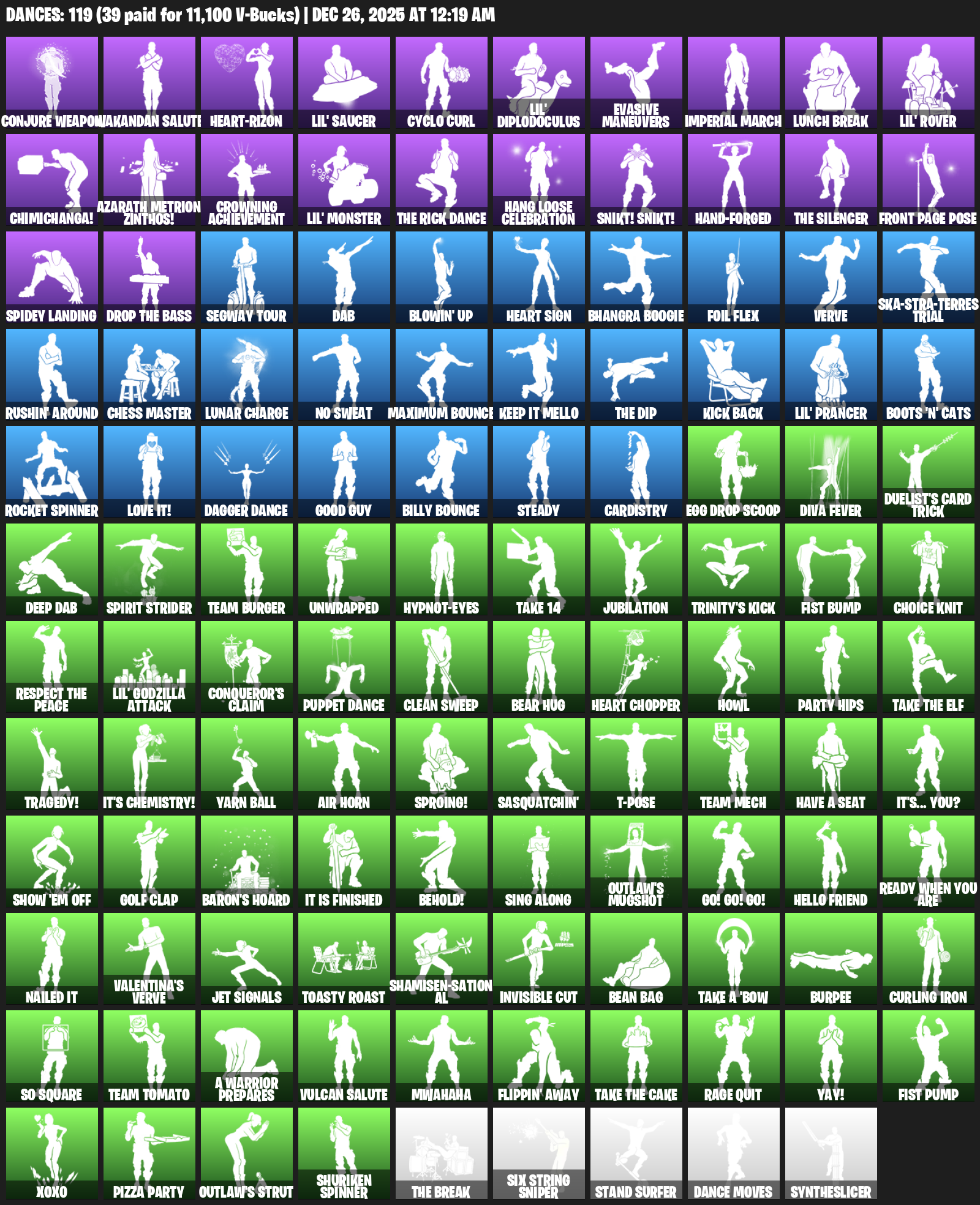 Conjure Weapon, Wakandan Salute, Heart-rizon, Lil’ Saucer, Cyclo Curl, Evasive Maneuvers, Imperial March, Lunch Break, Chimichanga!, Azarath Metrion Zinthos!, Crowning Achievement, Hang Loose Celebration, Snikt! Snikt!, Hand-Forged, Front Page Pose