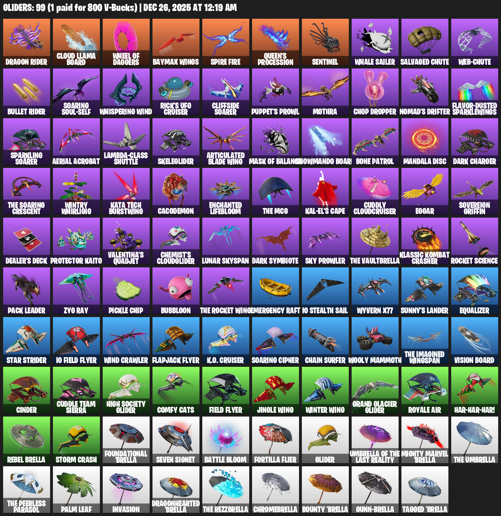 Cloud Llama Board, Baymax Wings, Queen’s Procession, Sentinel, Whale Sailer, Salvaged Chute, Bullet Rider, Soaring Soul-Self, Whispering Wind, Rick’s UFO Cruiser, Cliffside Soarer, Puppet’s Prowl, Mothra, Chop Dropper, Nomad’s Drifter, Flavor-Dusted Sparklewings
