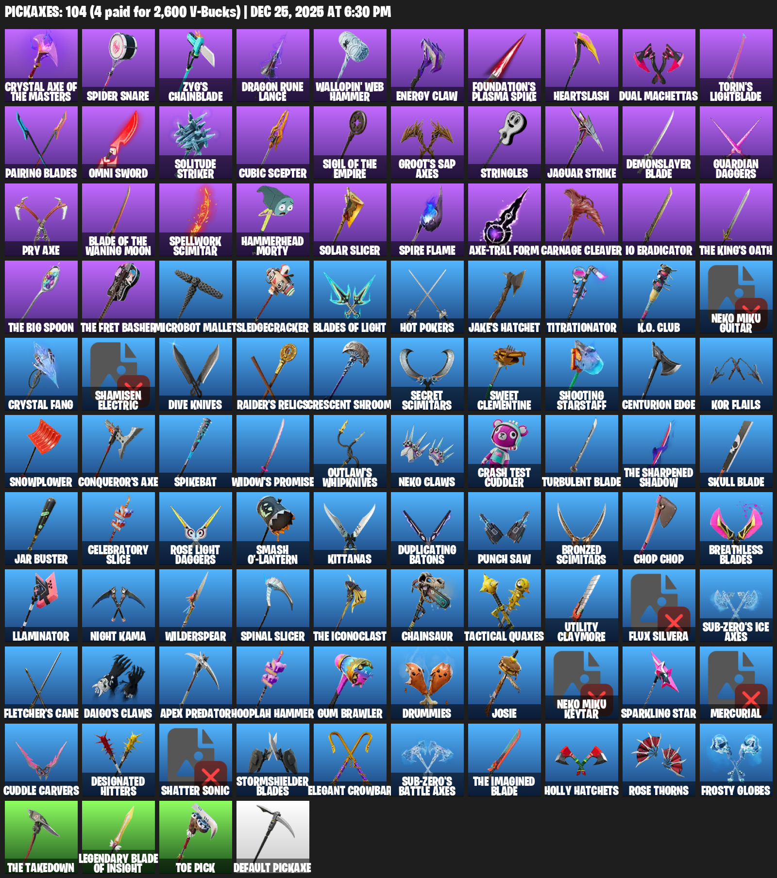 Spider Snare, Zyg’s Chainblade, Dragon Rune Lance, Wallopin’ Web Hammer, Energy Claw, Foundation’s Plasma Spike, Heartslash, Dual Machettas, Torin’s Lightblade, Pairing Blades, Omni Sword, Solitude Striker, Cubic Scepter, Groot’s Sap Axes, Stringles, Jaguar Strike, Demonslayer Blade, Guardian Daggers