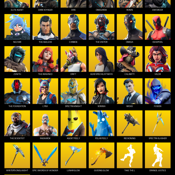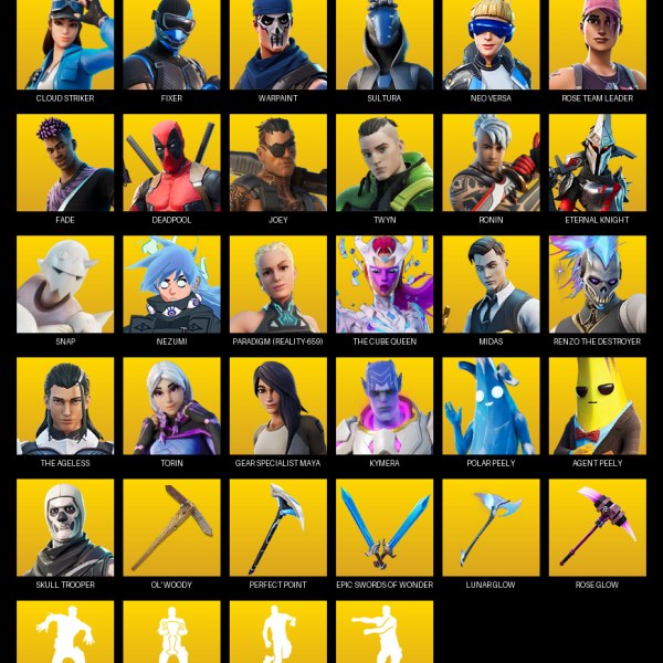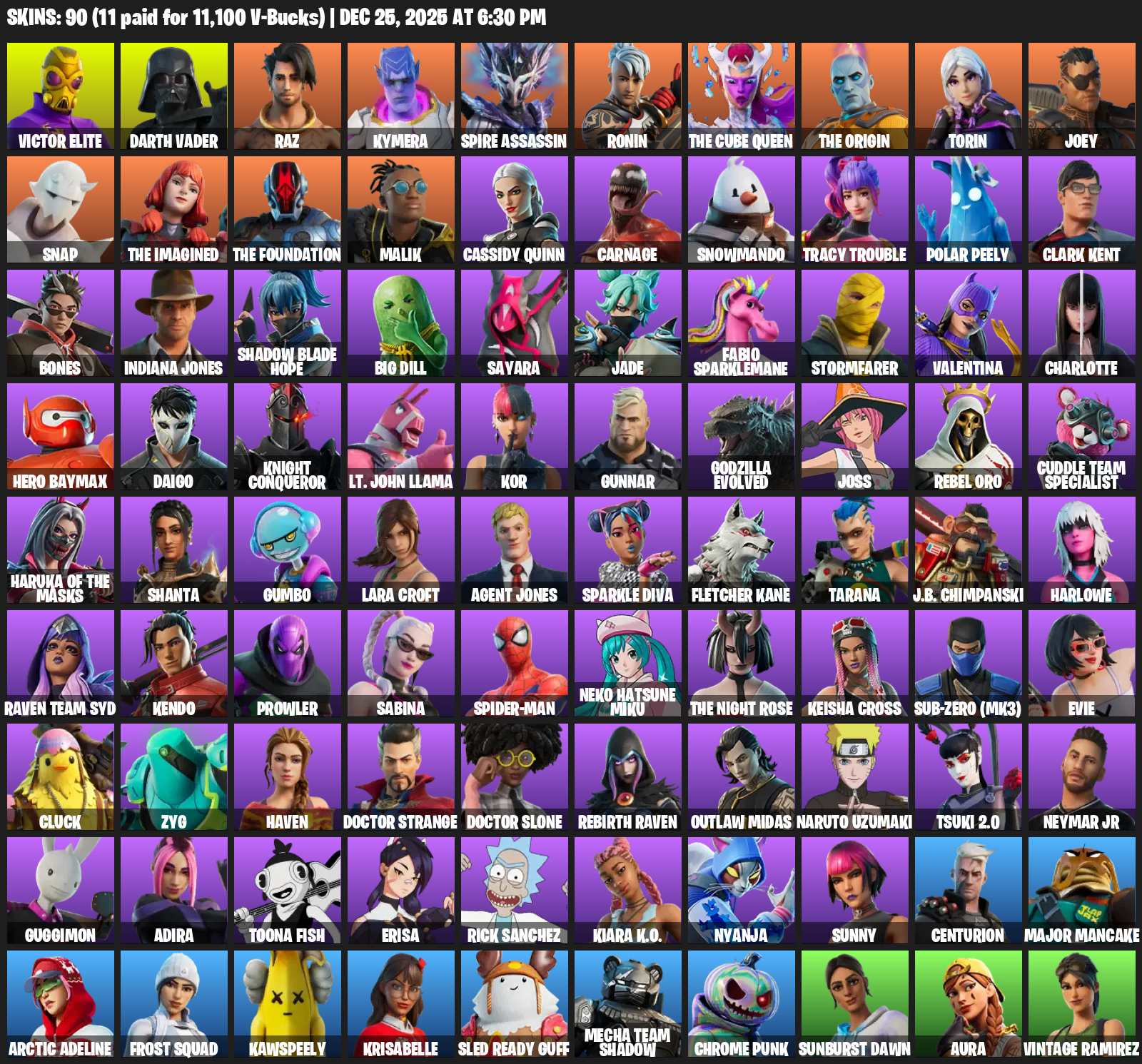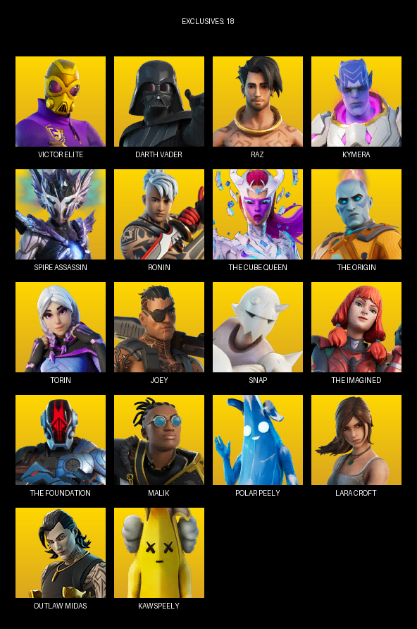 Lara Croft, Victor Elite, Darth Vader, Raz, Kymera, Spire Assassin, Ronin, The Cube Queen, Torin, Joey, Snap, Malik, Cassidy Quinn, Carnage, Snowmando, Tracy Trouble, Polar Peely